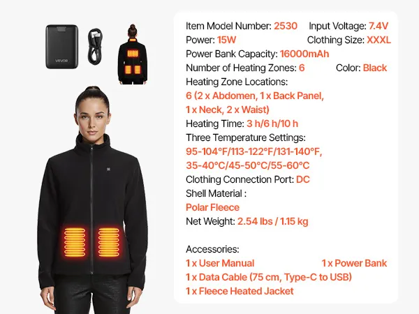 VEVOR Heated Fleece Jacket for Women, Heated Sweatshirt with 7.4V 16000mAh Rechargeable Power Bank Pack, 6 Heating Zones, 3 Temp Levels, 3h/6h/10h Warmth, for Winter Outdoor Camping, Black