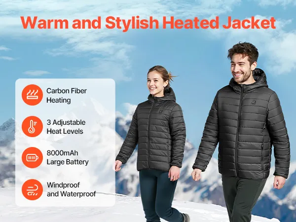 Heated Jacket with Carbon Fiber Elements. Delivers targeted warmth to multiple core areas: pockets (men’s only), chest, collar, and back. Features 3 heat levels up to 140℉, powered by a 7.4V 8000mAh battery for 4–10h heating. Lightweight padded fabric keeps you warm for hiking, camping, or hunting.