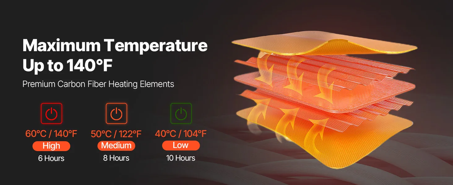 Premium carbon fiber elements ensure fast, even heating. With 3 adjustable settings up to 140℉, this lightweight jacket heater adapts to various cold weather conditions.