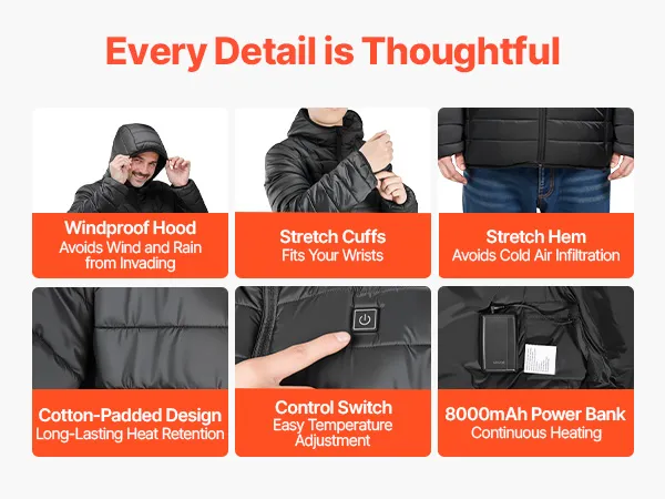 Adjustable hood, cuffs, and hem provide wind protection, while a simple one-button control and 8000mAh battery make this usb heated jacket perfect for everyday use.