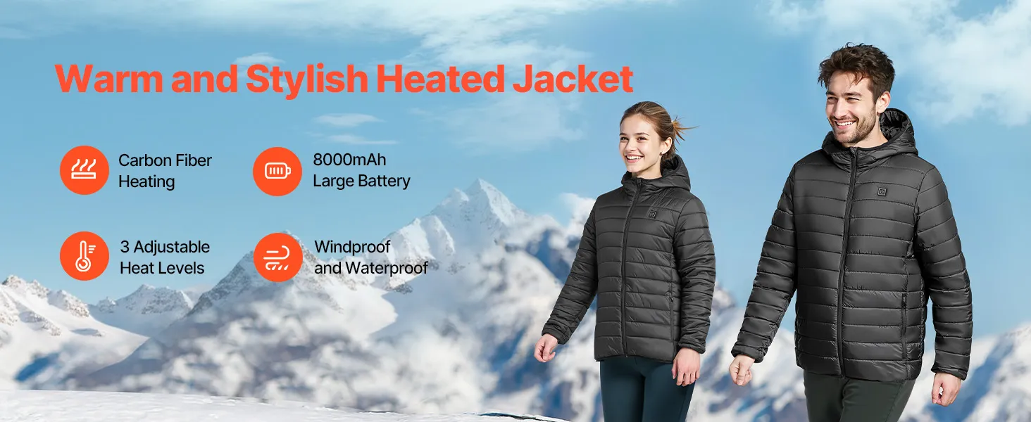Heated Jacket with Carbon Fiber Elements. Delivers targeted warmth to multiple core areas: pockets (men’s only), chest, collar, and back. Features 3 heat levels up to 140℉, powered by a 7.4V 8000mAh battery for 4–10h heating. Lightweight padded fabric keeps you warm for hiking, camping, or hunting.