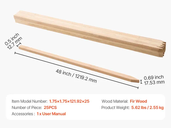 VEVOR Wooden Garden Stakes, 25 Pcs 17.53×12.7×1219.2 mm Survey Grading Stakes, Garden Ground Stake with Sharp Point, Fir Wood Plant Support Stake, Sign Posts for Silt Fence Yard Boundaries Baselines