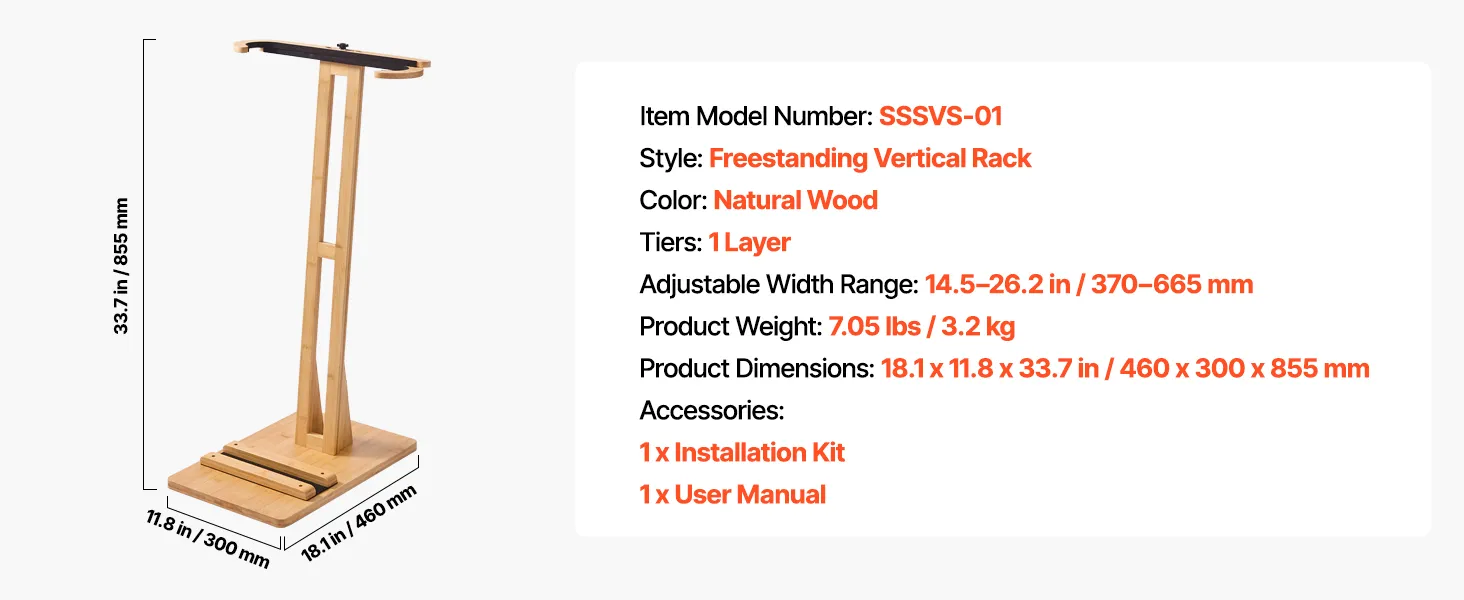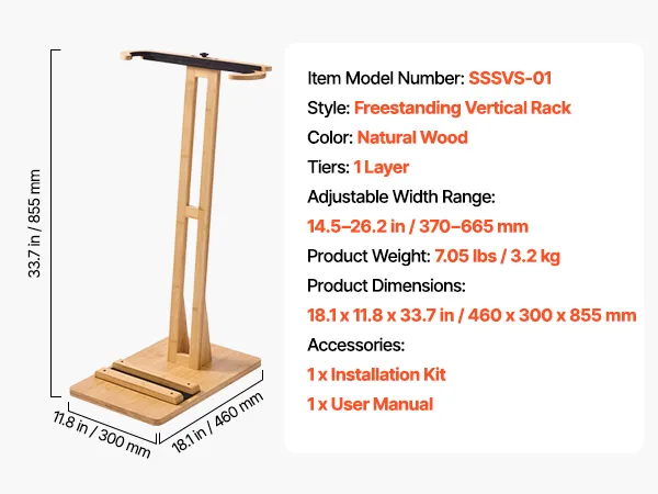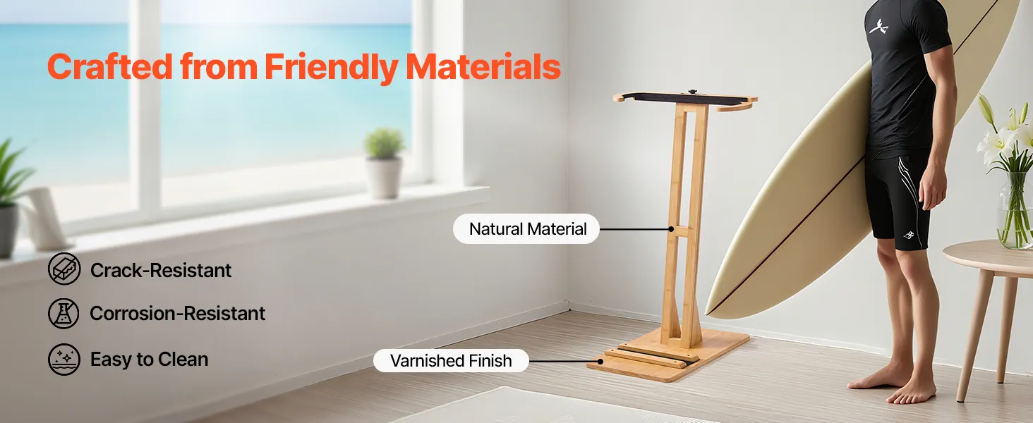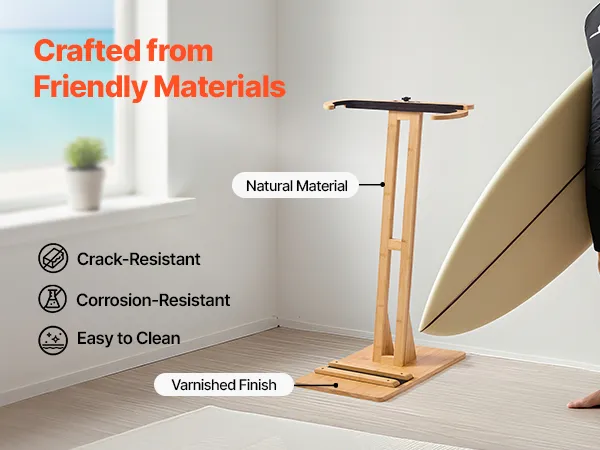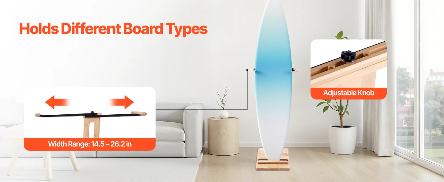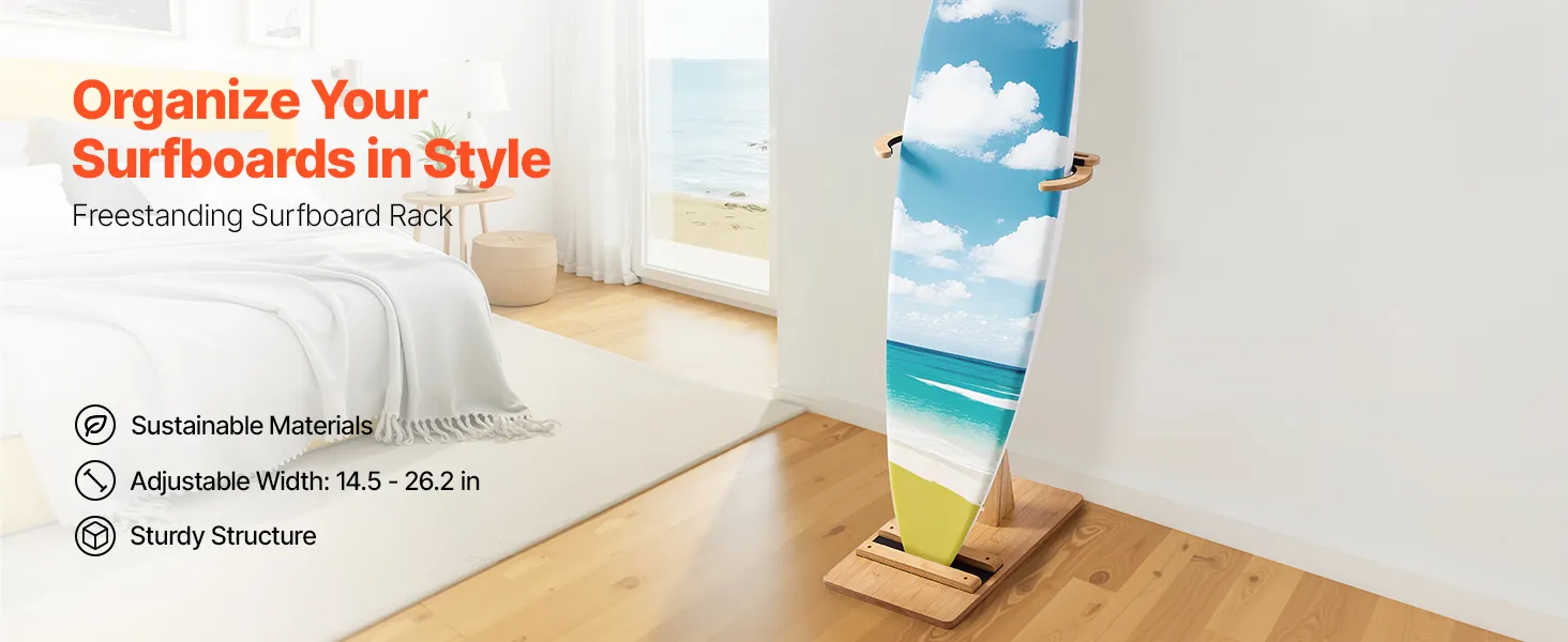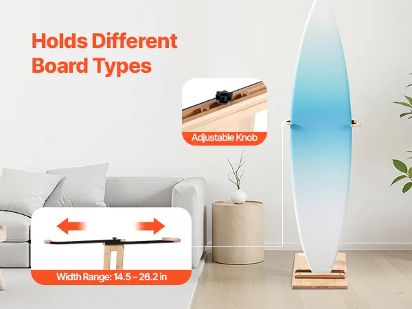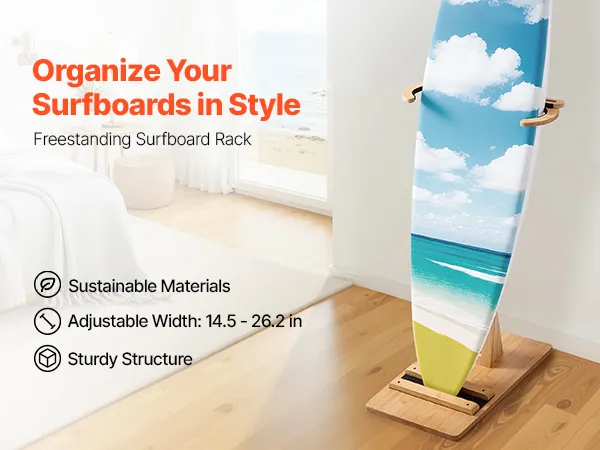 This adjustable surfboard rack 14.5–26.2 in / 370–665 mm fits surfboards, skis, kiteboards, and more, turning your board into a home display. The vertical design is space-saving, and the stable base avoids tipping. Scratch-proof pads safeguard your boards. Made from sustainable materials, it's easy to clean and ideal for bedrooms, living rooms, garages, or surf shops.