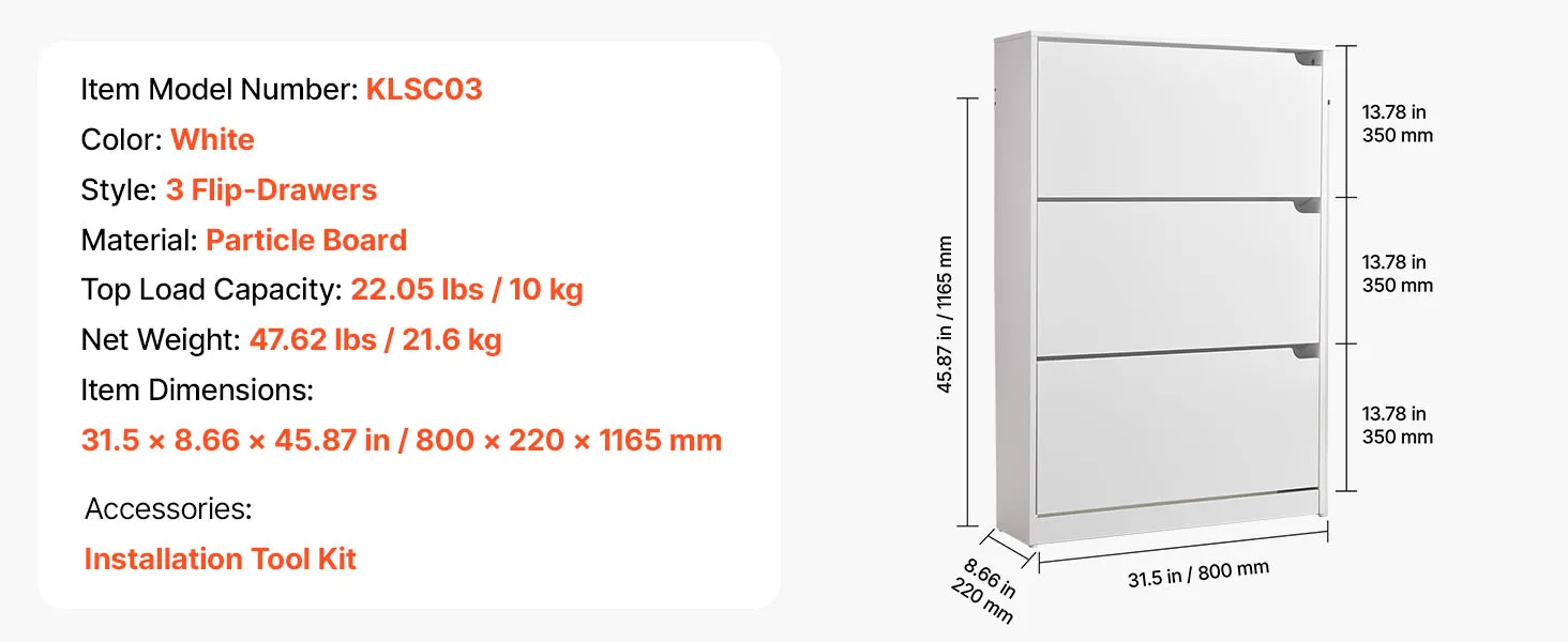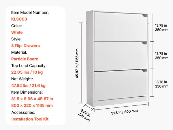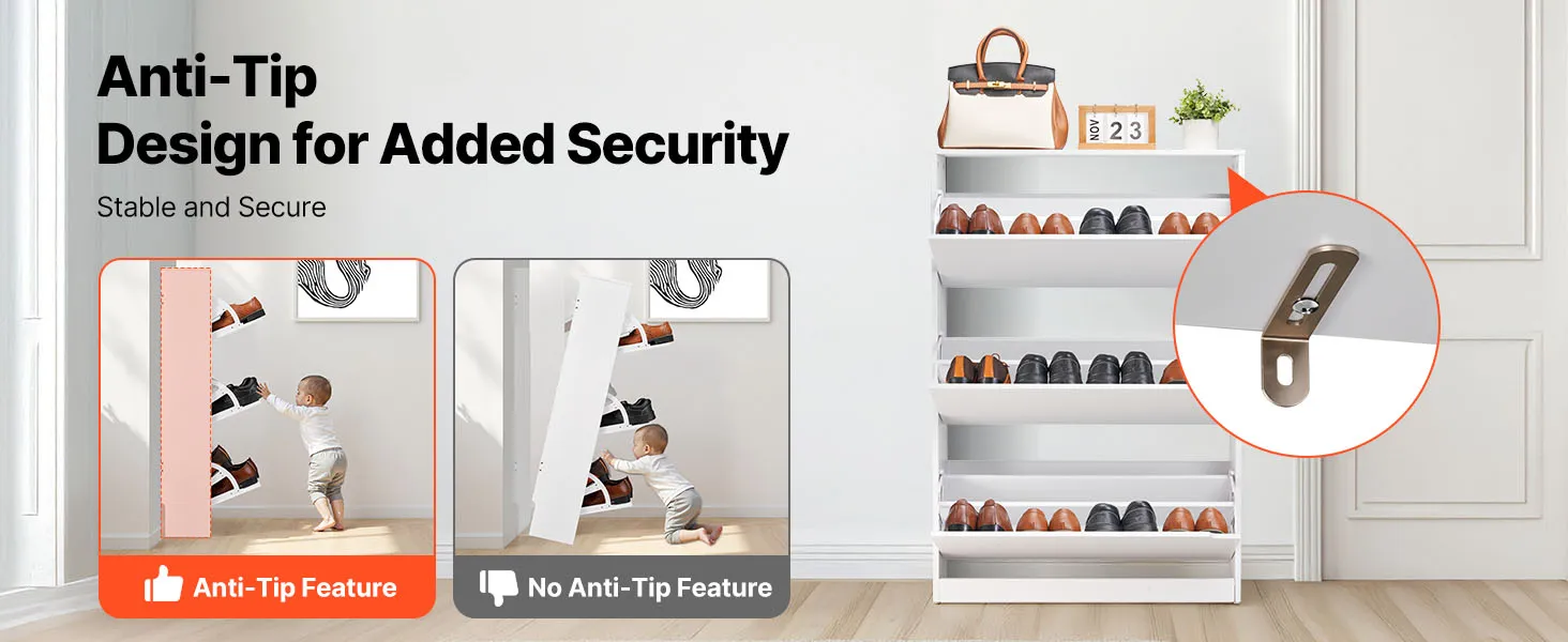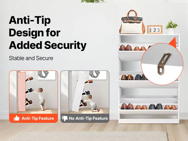 • Stable and Sturdy: An anti-tip device secures the shoe cabinet to the wall, reducing the risk of tipping. Made from particleboard for strength and durability. The top surface can support up to 22.05 lbs / 10 kg, suitable for decorations or storage baskets