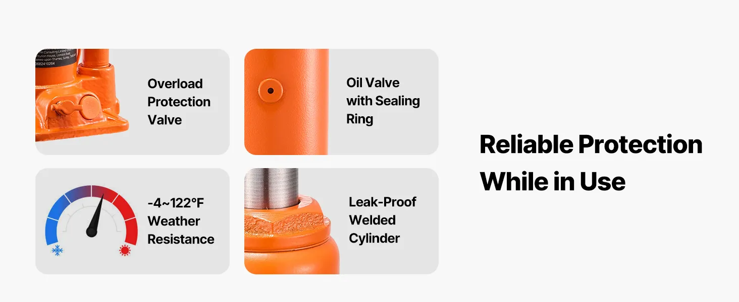 This bottle jack is designed with a reinforced wide base to reduce the risk of tilting, tipping, or base deformation.
