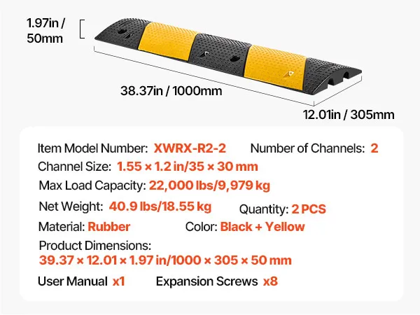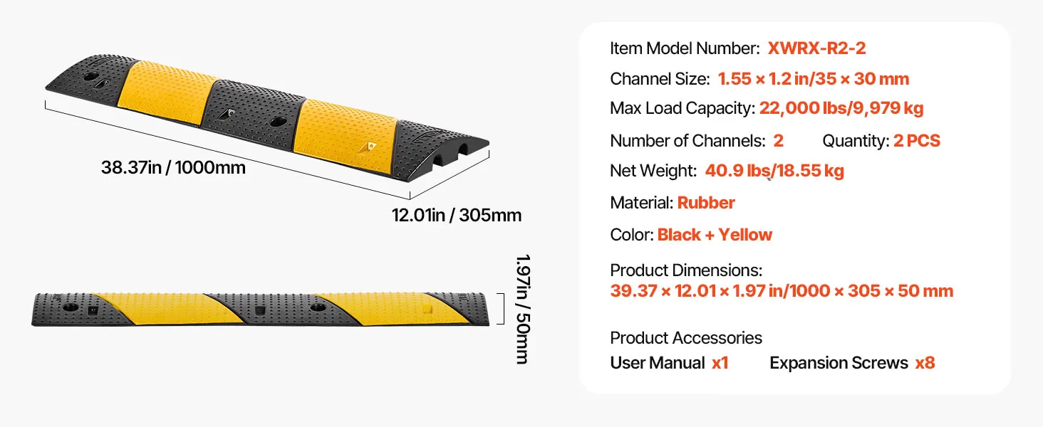 VEVOR 1000MM Rubber Speed Bump, 2 Pack, 2 Channel Heavy Duty Traffic Speed Hump, 9,979 kg/Axle Load Capacity, Cable Protector Ramp with Expansion Screws, for Asphalt Concrete Gravel Driveway and Road