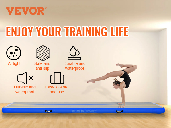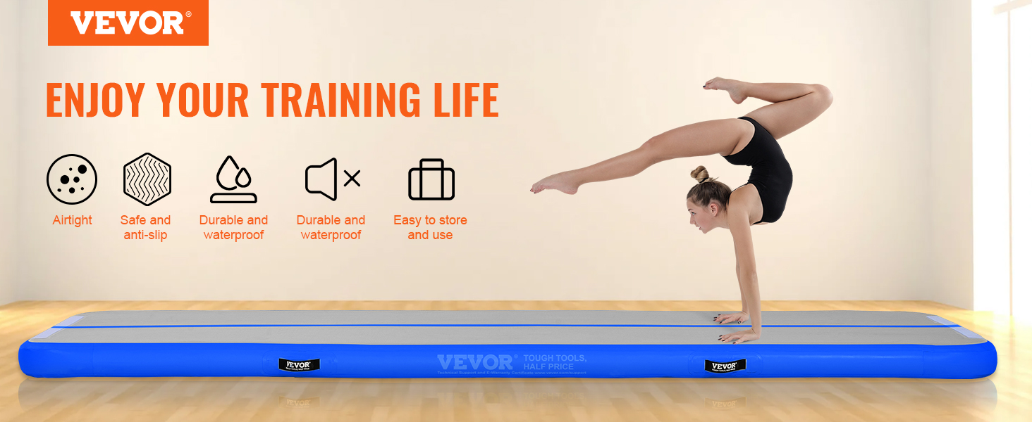 • High-Quality Material: This inflatable air gymnastics mat is made from multi-layered composite PVC material, with reinforced seams for improved airtightness and durability. The anti-slip material gives the inflatable gymnastics mat better traction and grip, making it abrasion-resistant, waterproof, soft, and highly elastic to ensure safe use during training. It operates noiselessly during use.