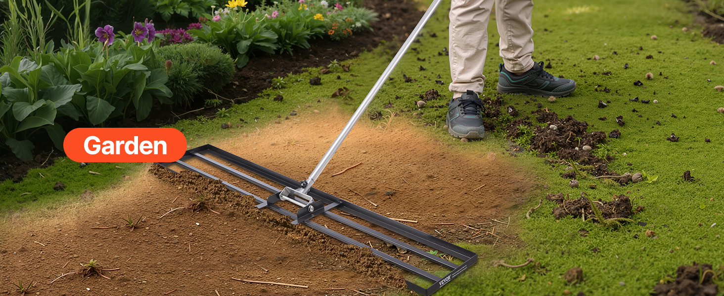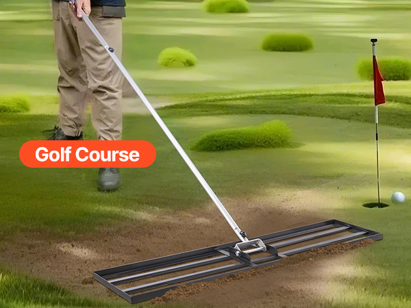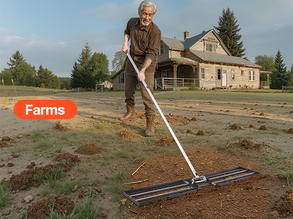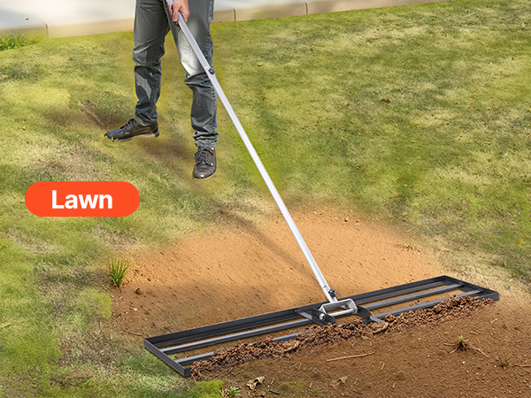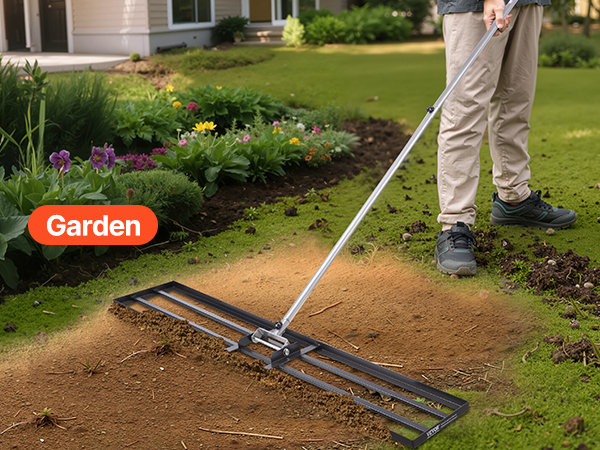 Our heavy-duty lawn leveling rake with wide ground plate, efficiently level the ground. The hard carbon steel with rust-resistant surface and solid welding for a long time outdoors. The 180° rotating handle with rubber sleeve for a comfortable grip. Ideal for farms, gardens, golf courses.