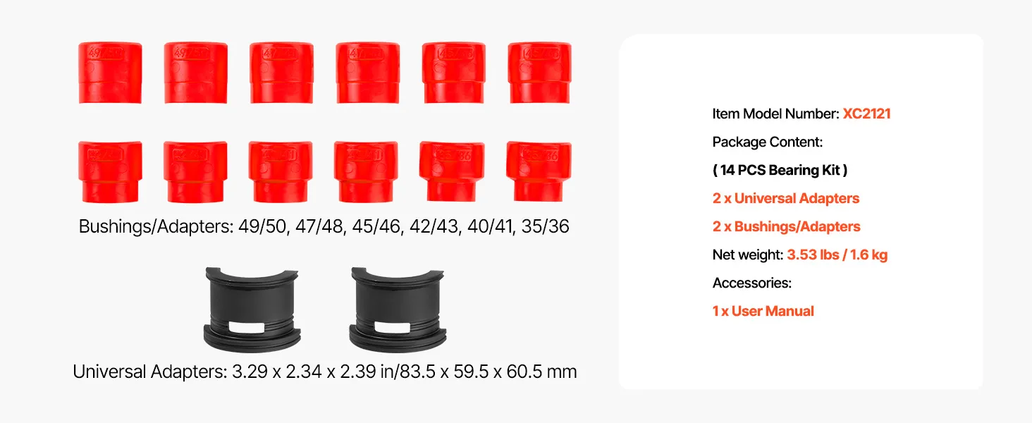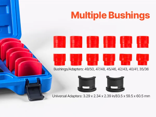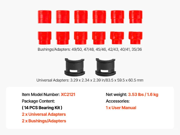 Bearing and seal driver kit includes disc sleeves in multiple sizes and a complete assembly tool in the box. Our bearing press kit allows you to quickly and securely assemble and meet your bearing removal needs.