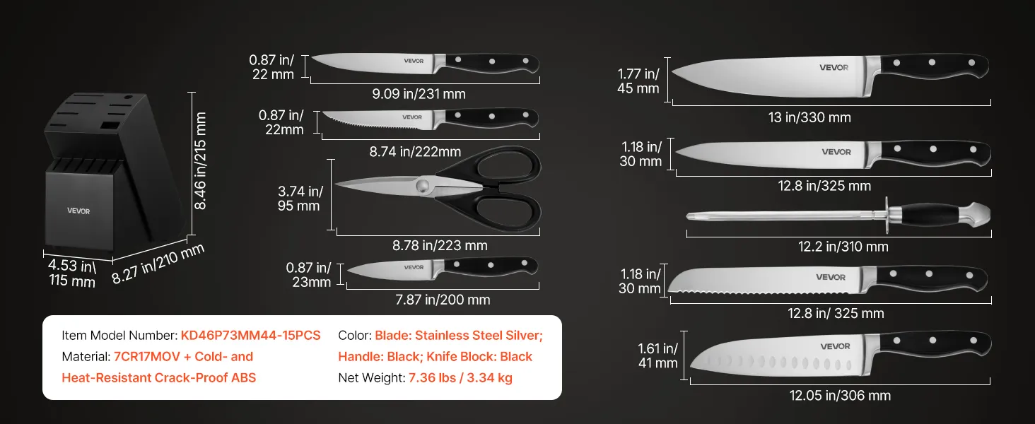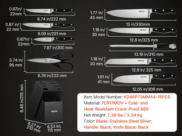Наш набір ножів з 15 частин покриває всі ваші потреби в різанні!Виготовлений з високовуглецевої нержавіючої сталі з точною заточкою, він залишається гострим і довговічним ергономічні ручки забезпечують зручне зчеплення та зменшують втом оключає дерев'яний блок преміум-класу та 8-дюймову заточку для легкого зберігання та обслуговуванн стильний дизайн робить його чудовим подарунком для себе або близьких.