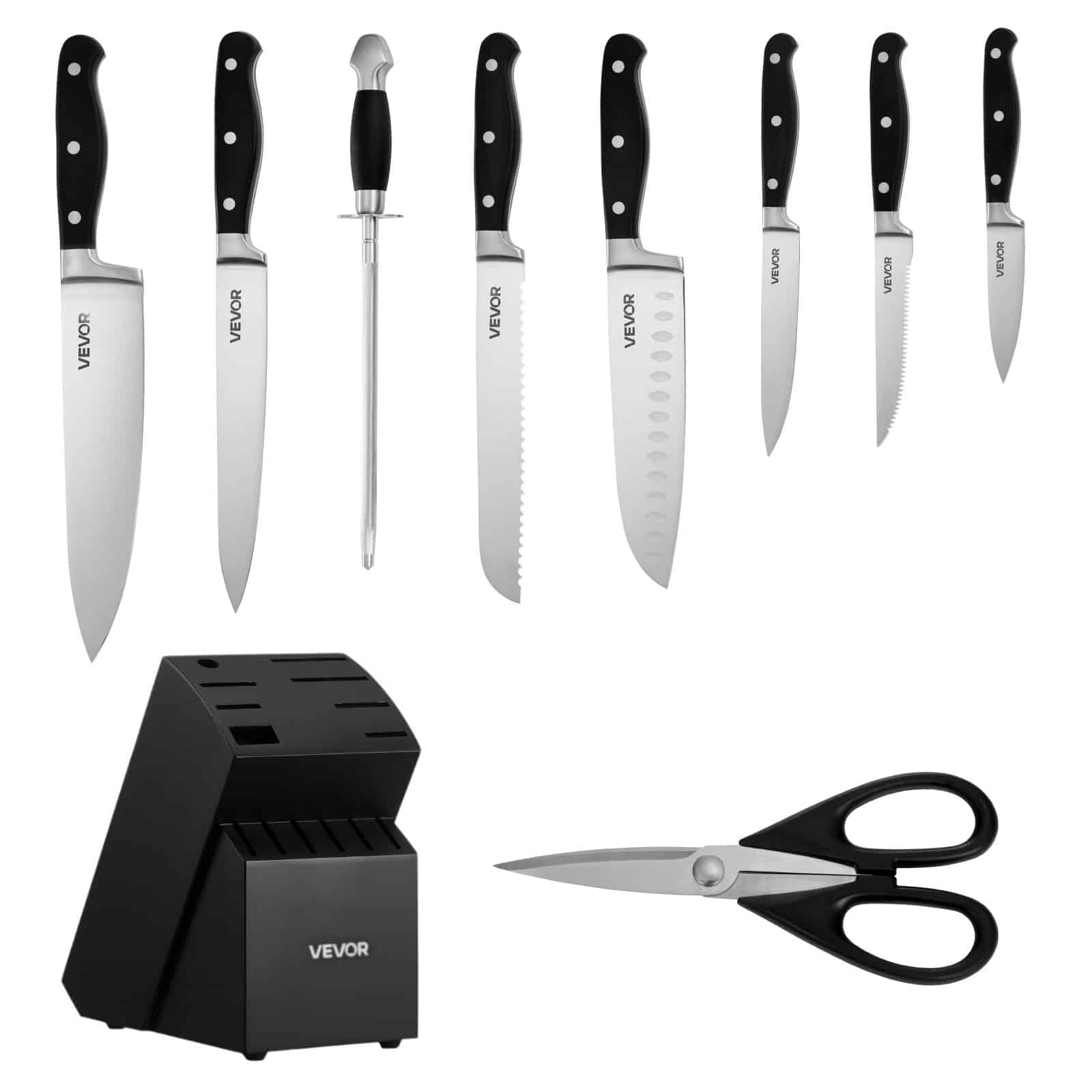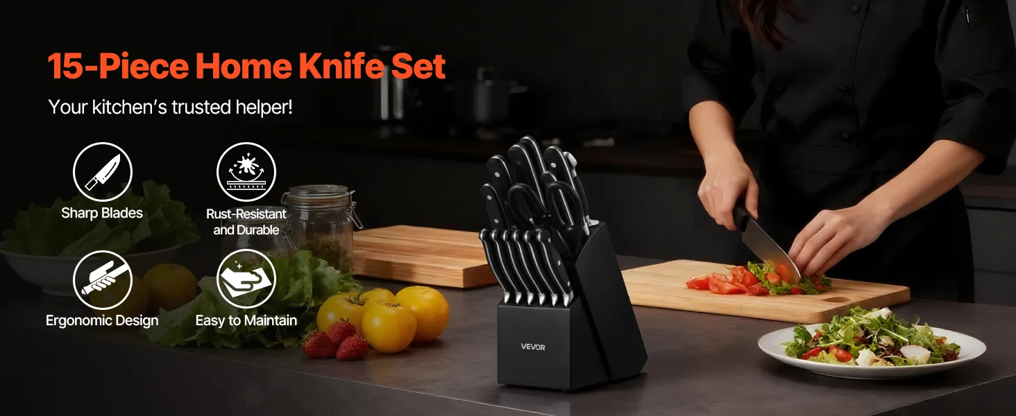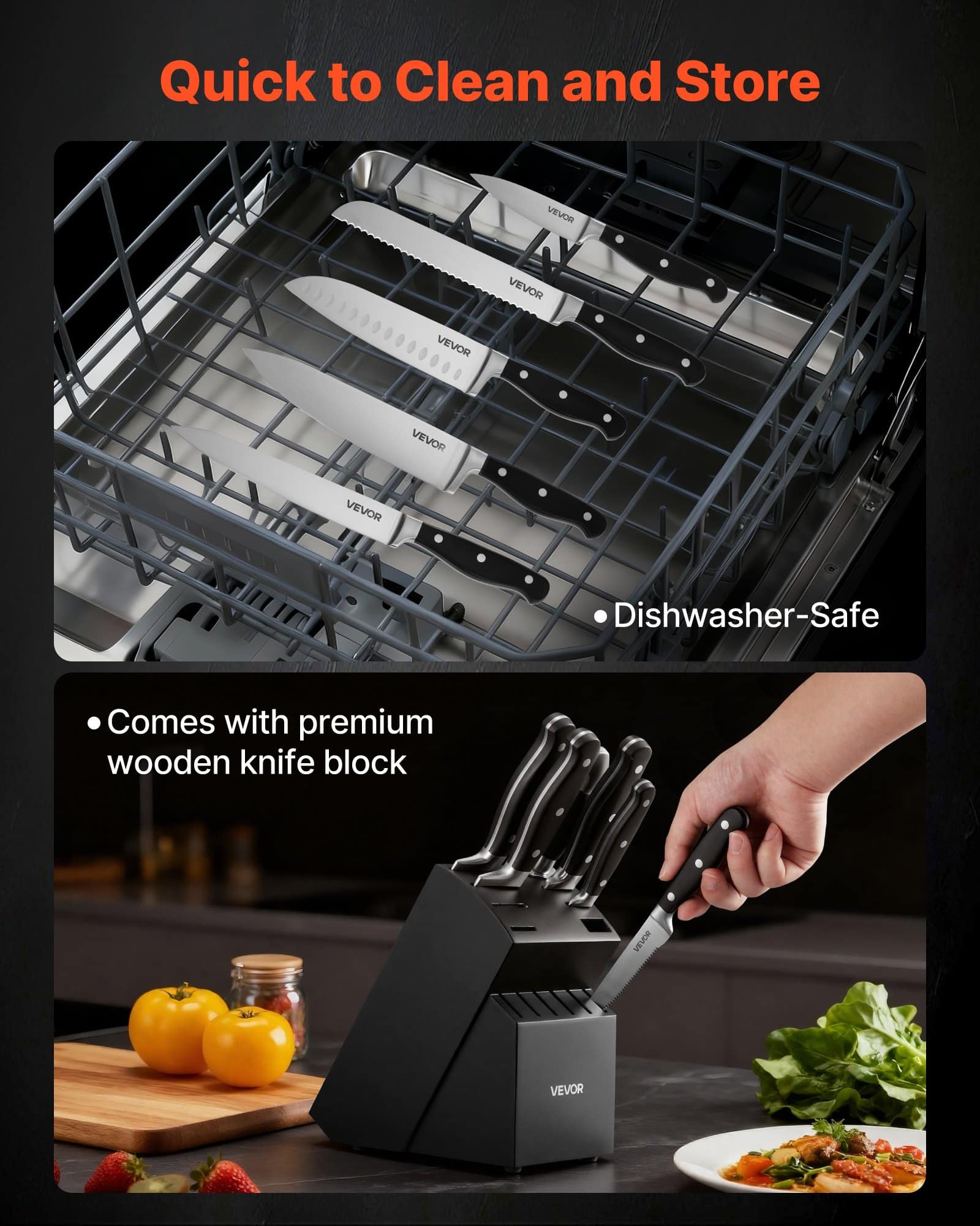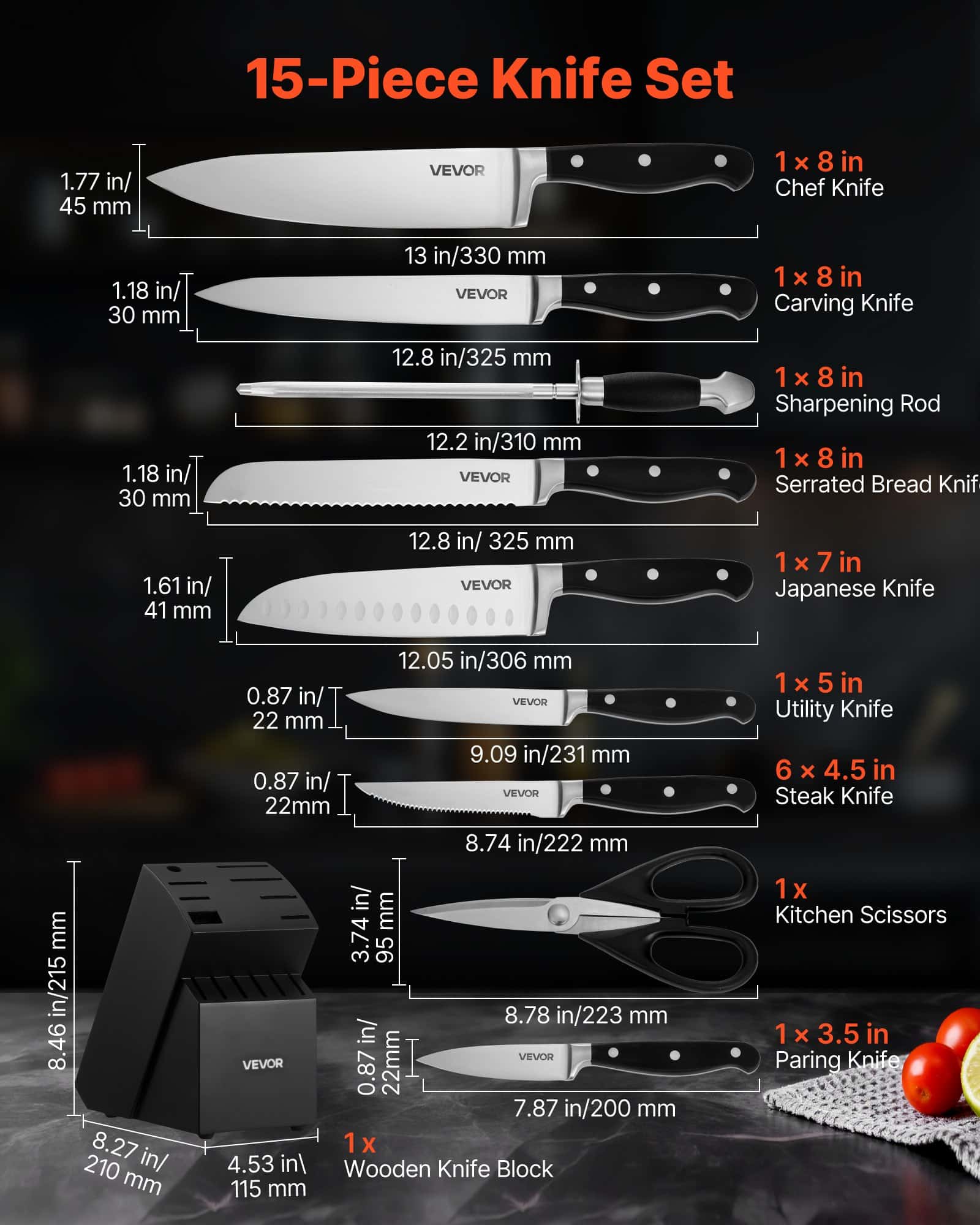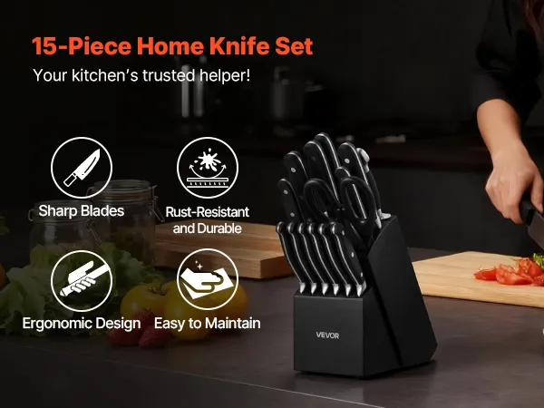 VEVOR Kitchen Knife Set with Block and Sharpener, 15 Piece High Carbon Stainless Steel Sharp Knife Set, Kitchen Cutlery with Crack-Resistant Handle, Sharpening Rod and Wooden Block, for Home Cooks