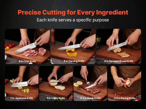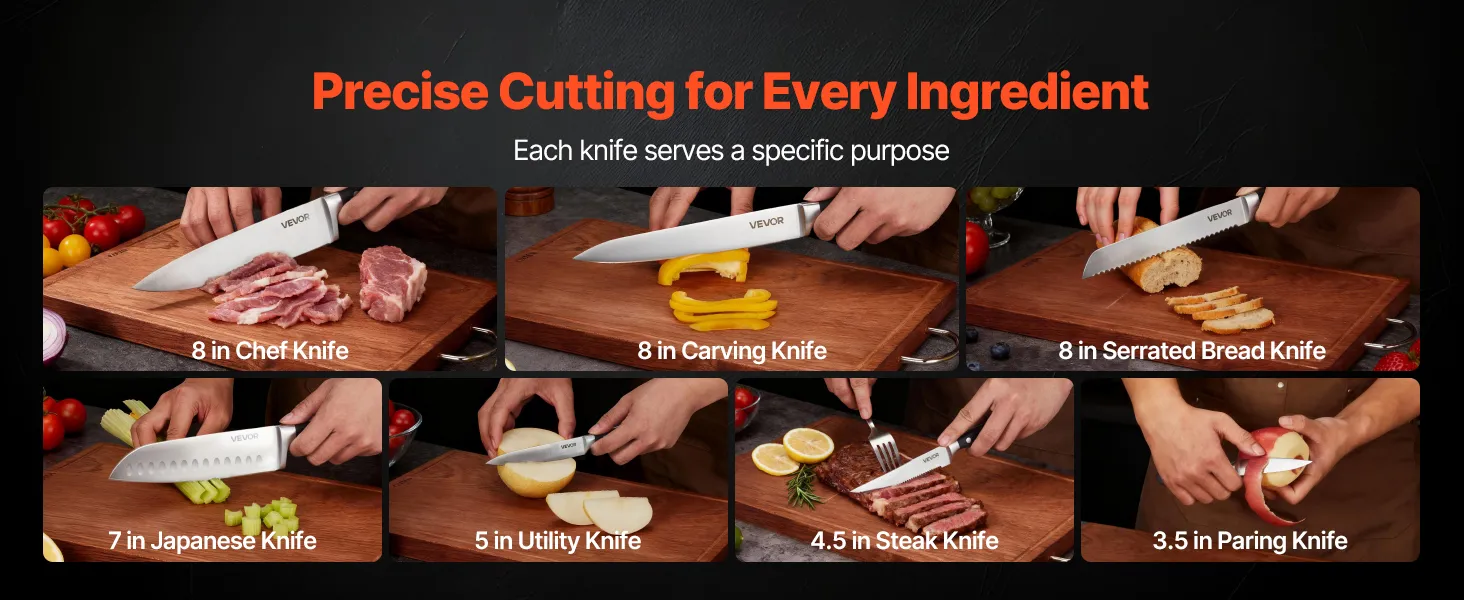Кожне лезо майстерно шліфується і заточується для виняткової гострот арізноманітний вибір ножів забезпечує точне поводження з різними інгредієнтами, заощаджуючи ваш час і підвищуючи ефективність у кожному підготовчому завданні.