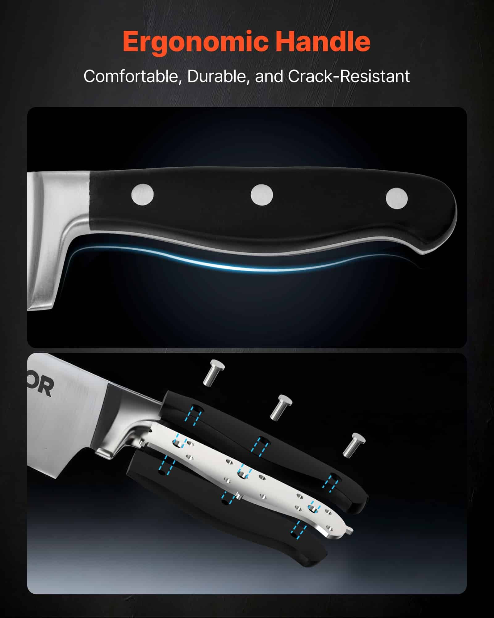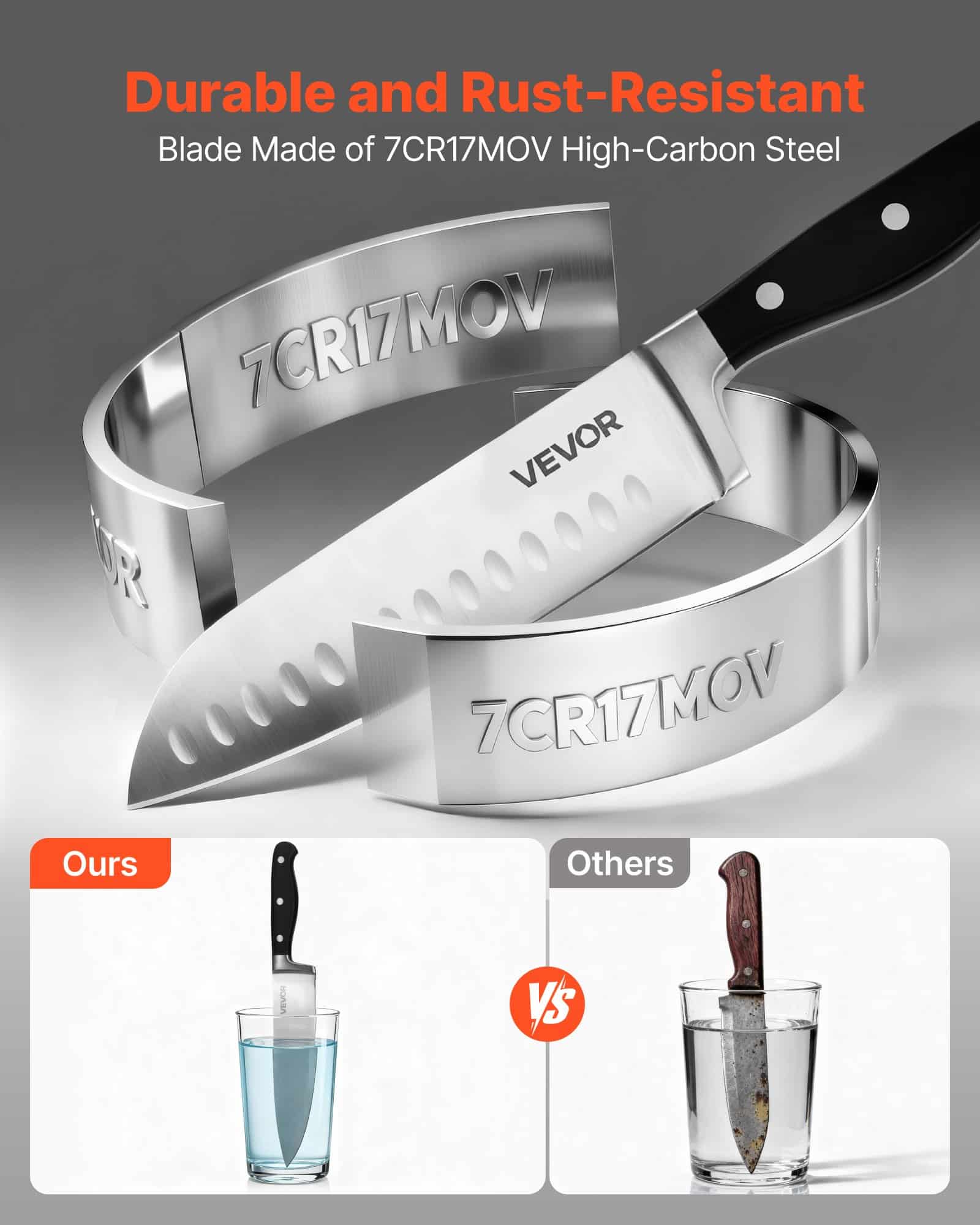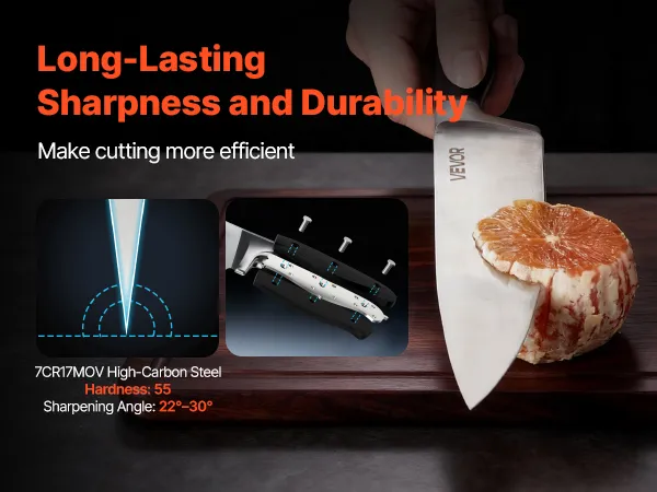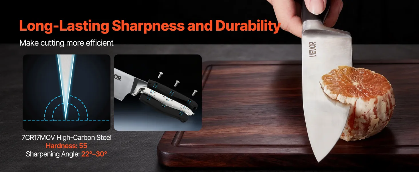 Виготовлений з високовуглецевої сталі преміум-класу, цей набір ножів пропонує ідеальний баланс твердості та міцності, зберігаючи тривалу гостроту без частого заточенн ручка стійка до тріщин і надійно прикріплена, що забезпечує стабільність і впевненість під час кожного використання.