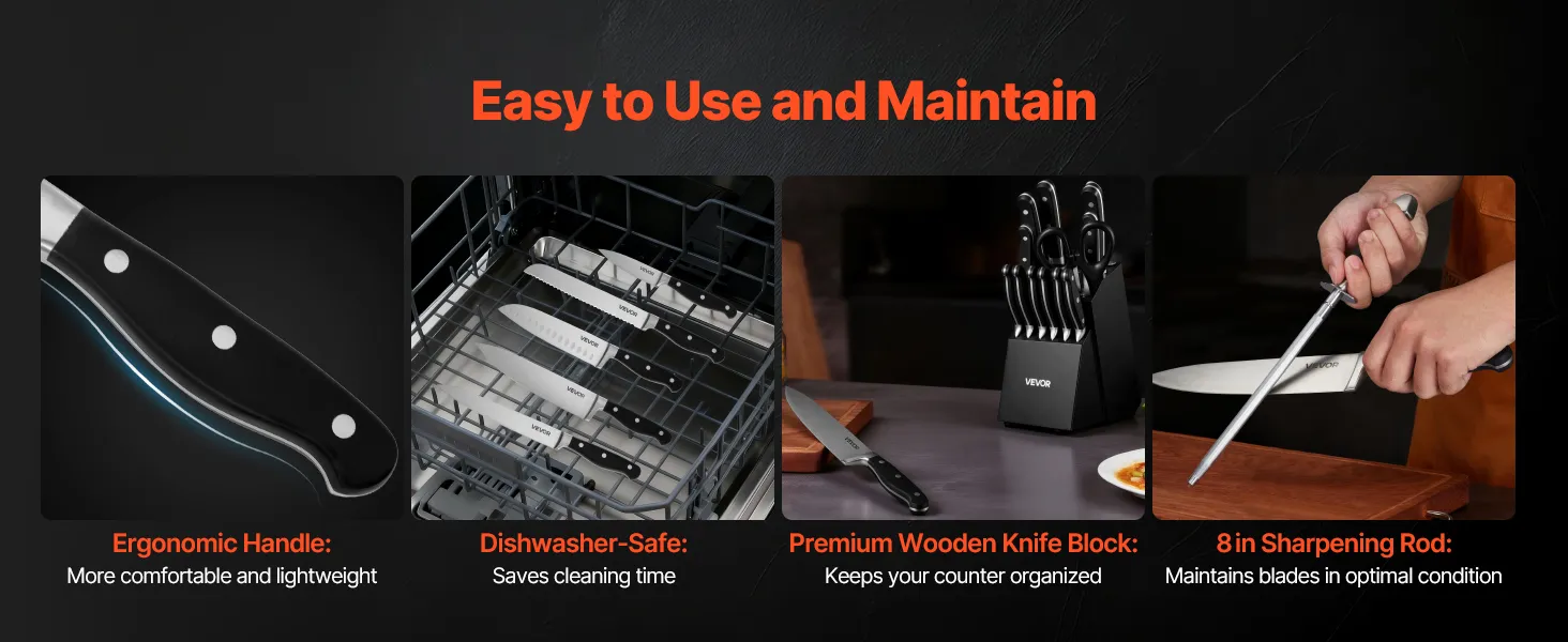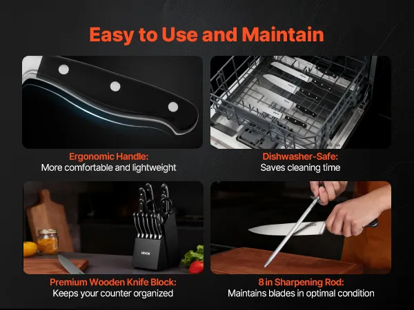 Кожна деталь цього набору призначена для зручност ергономічна ручка забезпечує комфорт і легке зчеплення, а безпечна для посудомийної машини конструкція полегшує чистк дерев'яний блок ножа дозволяє легко зберігати, а стрижень для заточування допомагає підтримувати гостроту леза.