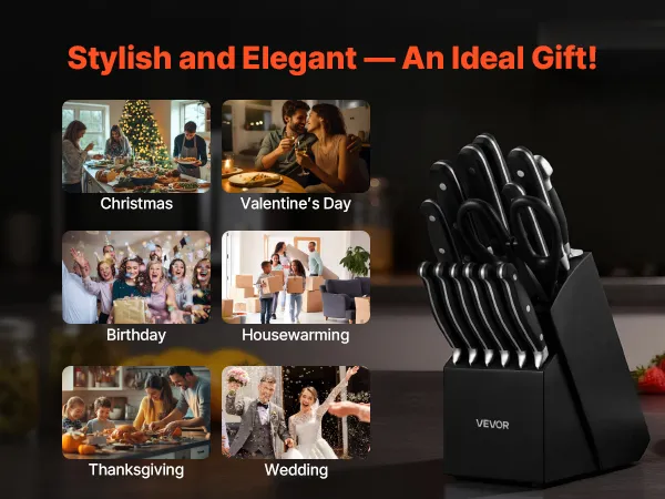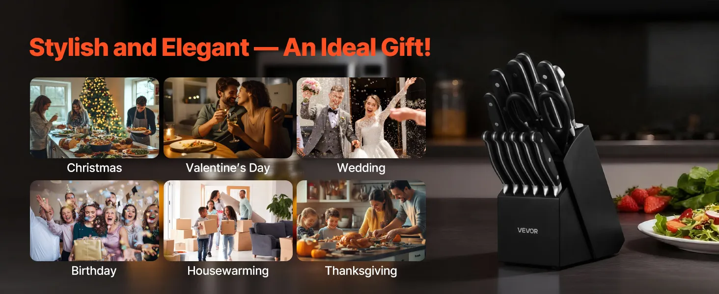 Цей набір ножів з нержавіючої сталі поєднує в собі елегантність і практичність, покращуючи вашу кухню сучасним, вишуканим штрихо е ідеальний подарунок на День Святого Валентина, Різдво, весілля та дні народженн Це незабутній сюрприз для любителів кулінарії.