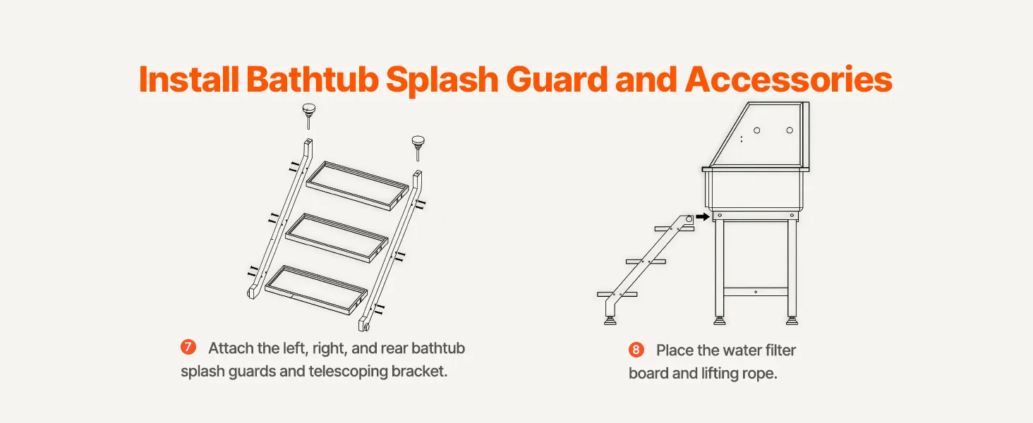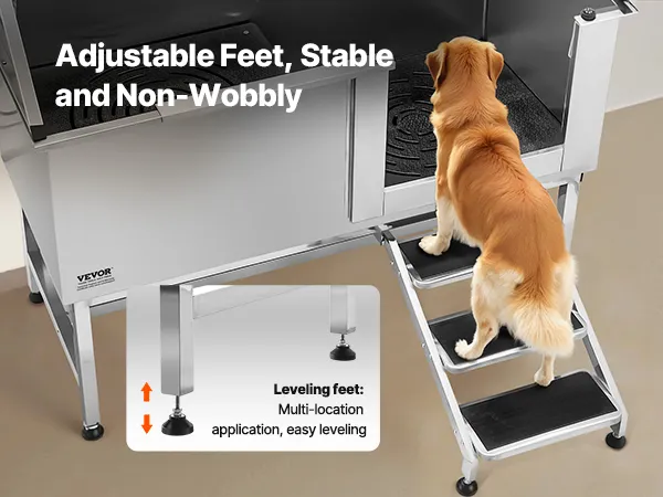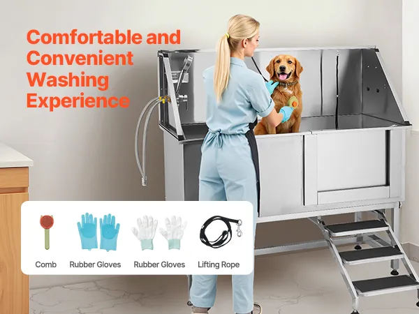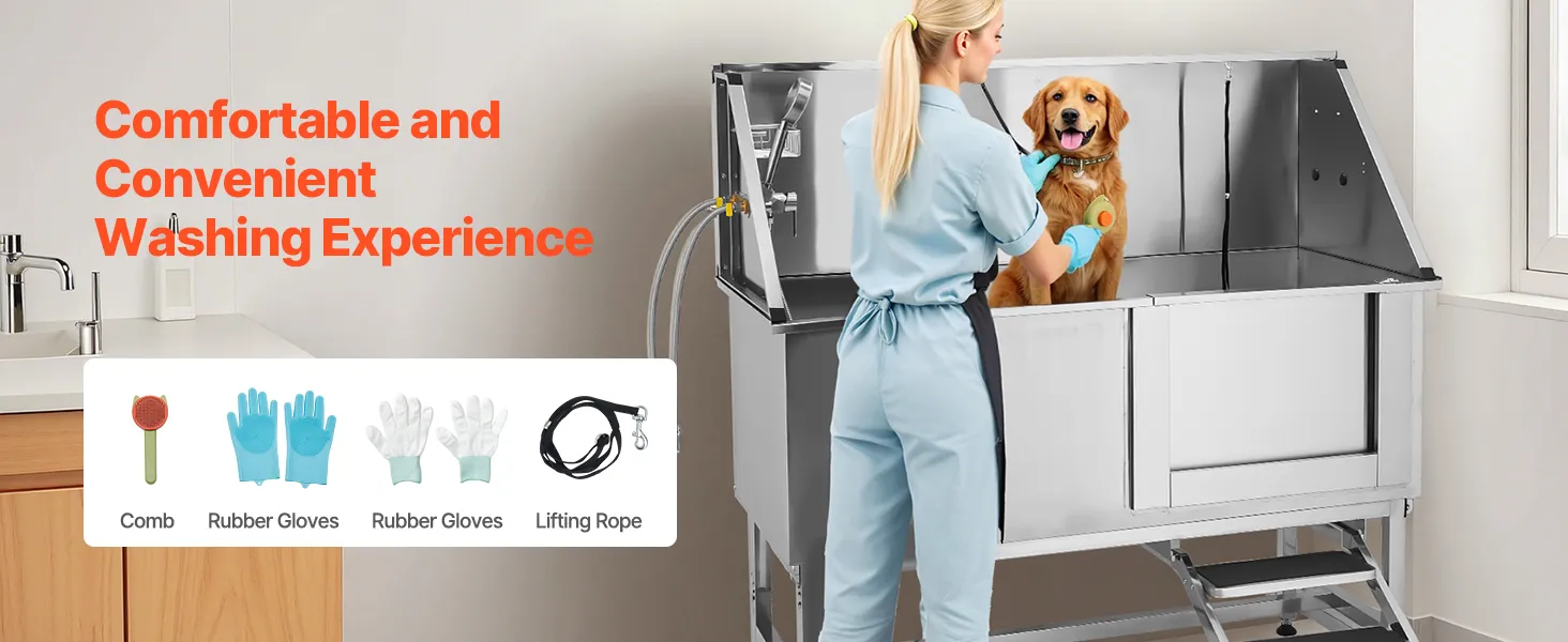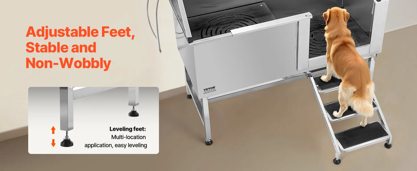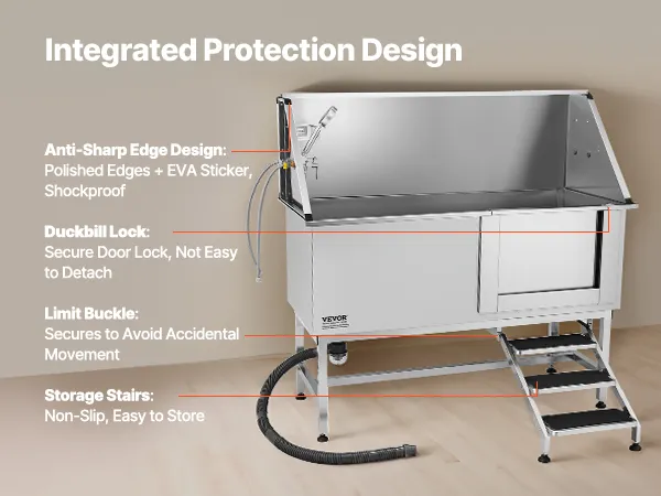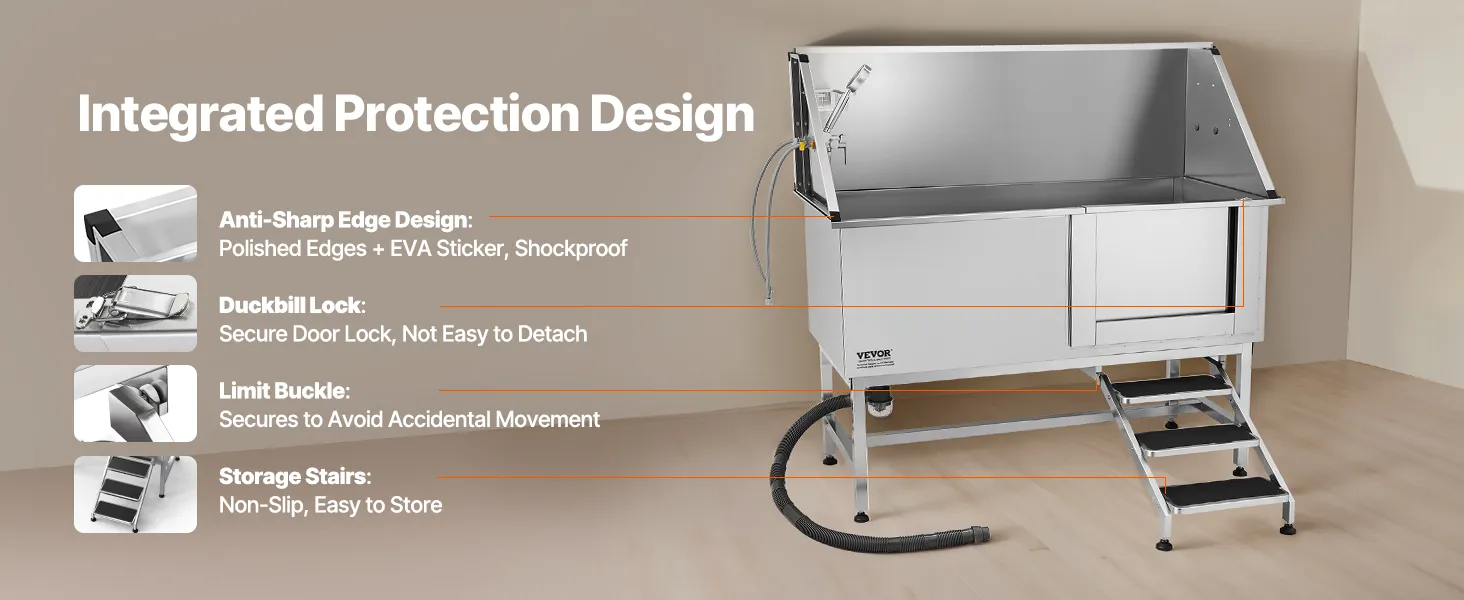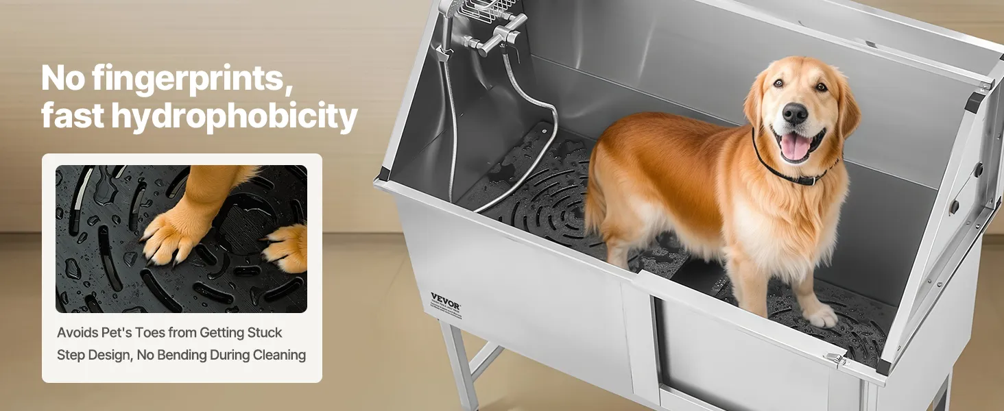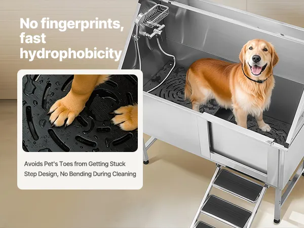 This tub ensures no water leakage. Made from stainless steel, it is corrosion-resistant and sturdy, maintaining its new look over time. The tub features smooth edges, ensuring security for both pets and users during bathing.