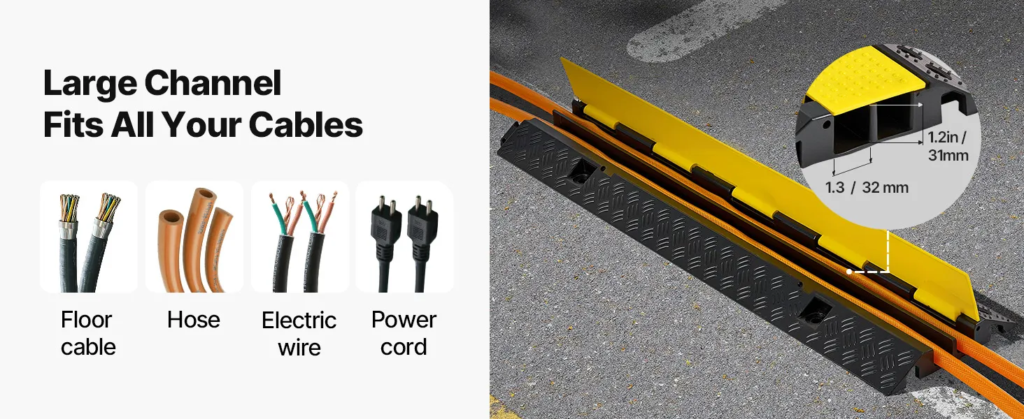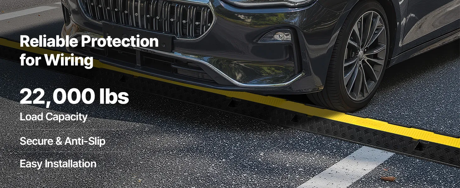 Lay your cables quickly with a flip-open top cover. Stands up to 22,000 lbs/axle, it won’t crack or deform even under heavy truck traffic. The dual-channel design lets you run two separate cables without tangling, and accommodates multiple cables and wires. Connect easily and stay firmly in place.