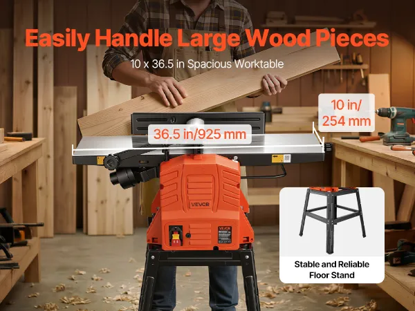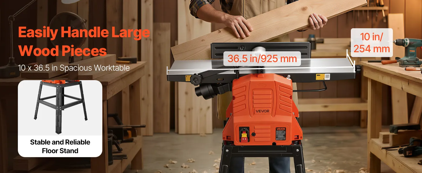 Our benchtop jointer planer is designed with a 10 x 36.4 in (254 x 925 mm) worktable, providing ample space for large-scale projects, while the sturdy stand ensures stable, secure, and precise cutting.