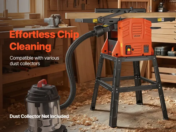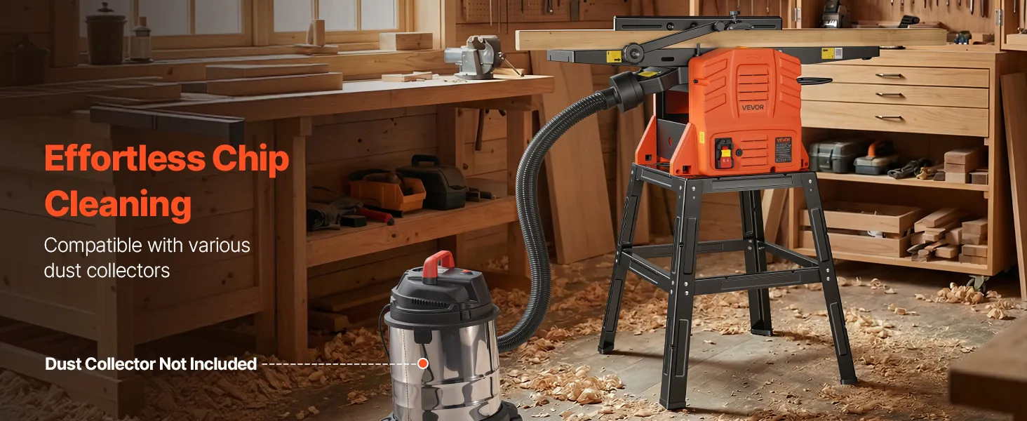 Our wood jointer for woodworking is equipped with a dust port and is compatible with various types of vacuum cleaners (not included) for quick and efficient cleanup.