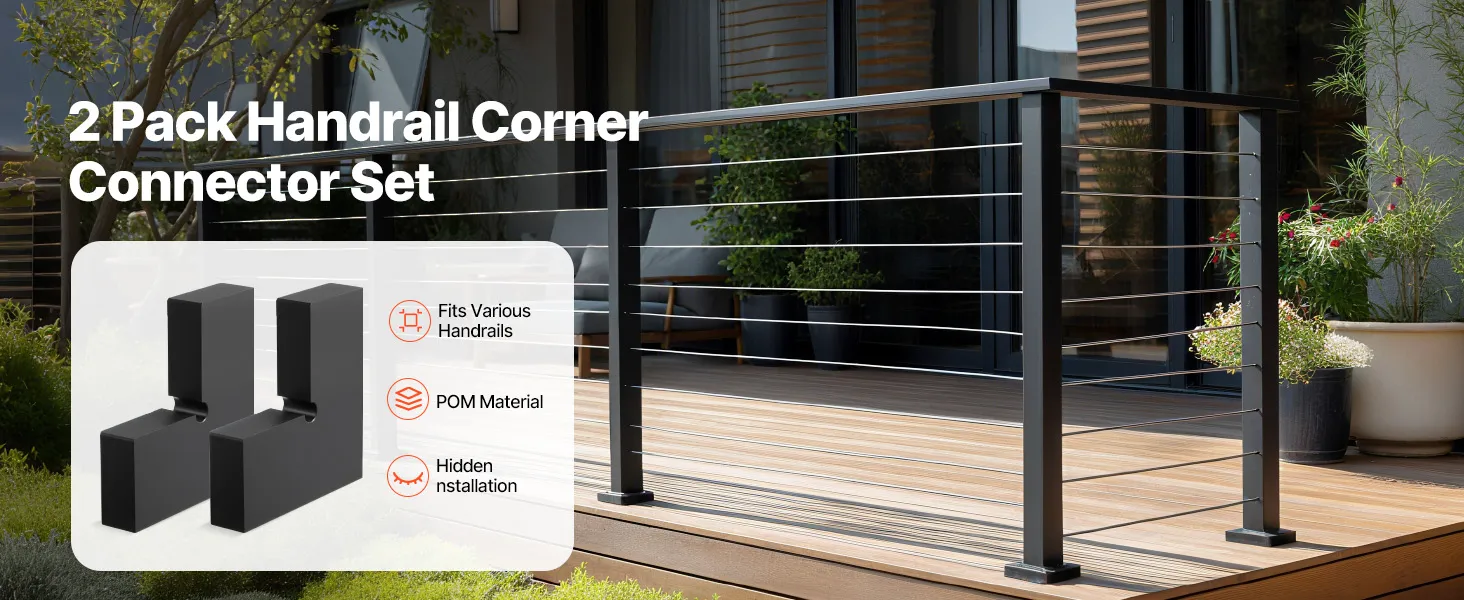 VEVOR 2 Pack Corner Connectors for Handrail, Extension Stair Railing Accessories, POM Hand Rail Connector Fittings for Rectangular Cable Railing, Deck Cable Rail System Outdoor, Matte Black, HT-05