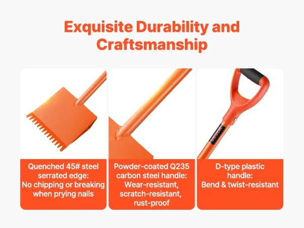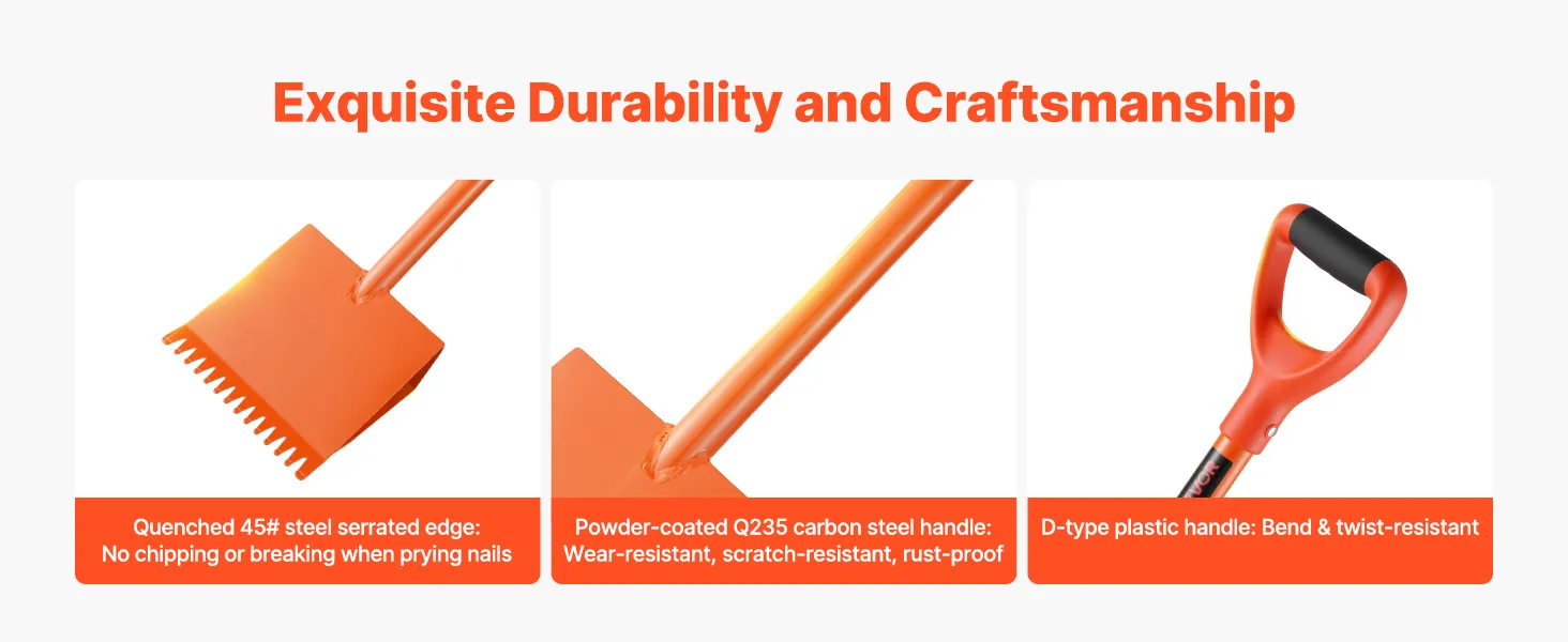 • High-Strength Sturdy Material: Forged from heat-treated 45# steel, the roofing shovel offers excellent durability. The serrated blade easily pries out nails, offering excellent impact resistance and durability for tough demolition tasks