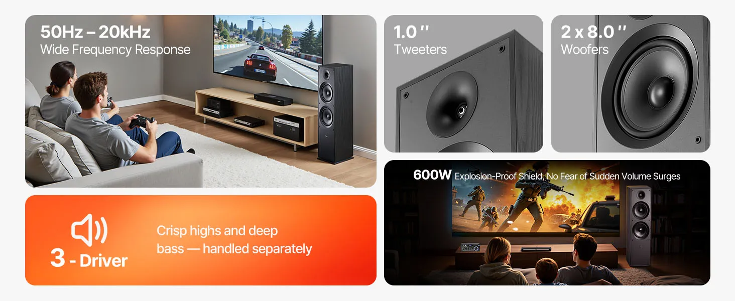 • Withstand High-Impact Audio: Whether it’s an explosive action scene, a screaming guitar solo, or bass-heavy party tracks, this tower speaker handles it all with 600W peak power