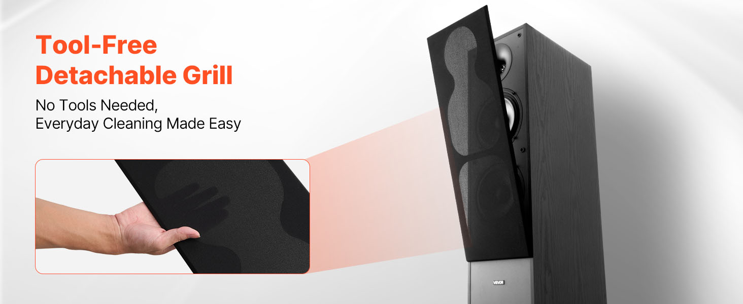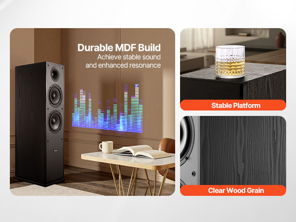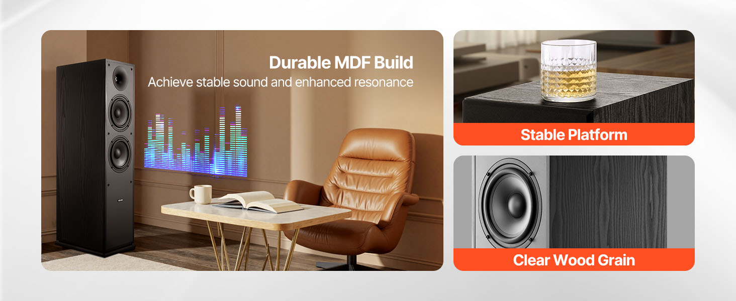 The MDF cabinet of our floor-standing tower speaker reduces unwanted resonance and vibration, providing cleaner, more accurate audio performance.