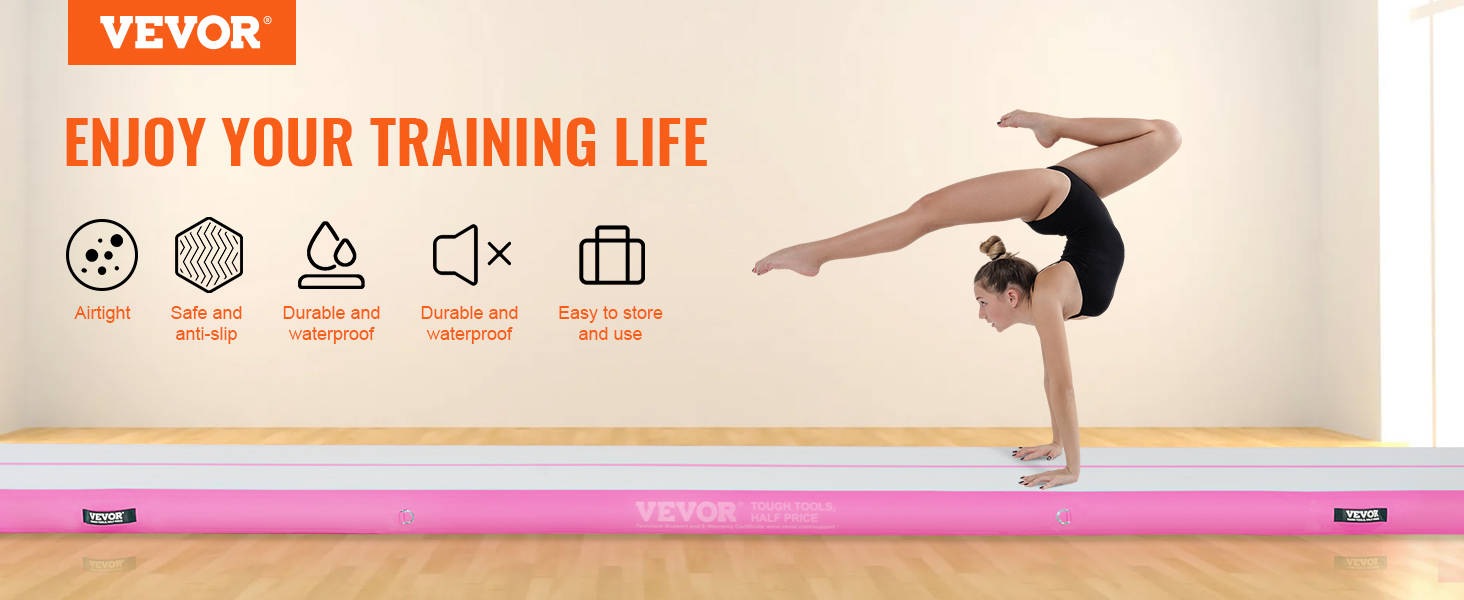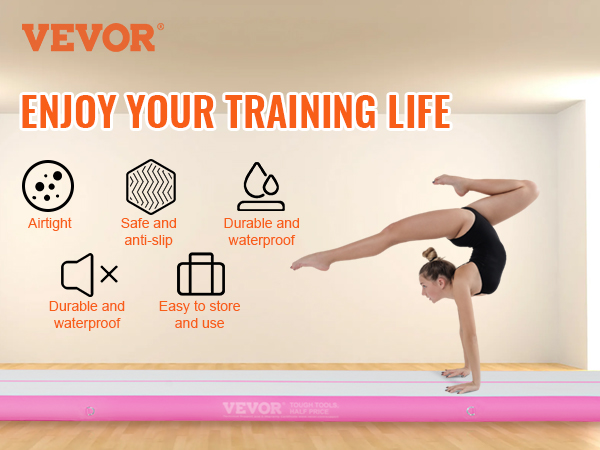 • High-Quality Material: This inflatable air gymnastics mat is made from multi-layered composite PVC material, with reinforced seams for improved airtightness and durability. The anti-slip material gives the inflatable gymnastics mat better traction and grip, making it abrasion-resistant, waterproof, soft, and highly elastic to ensure safe use during training. It operates noiselessly during use.