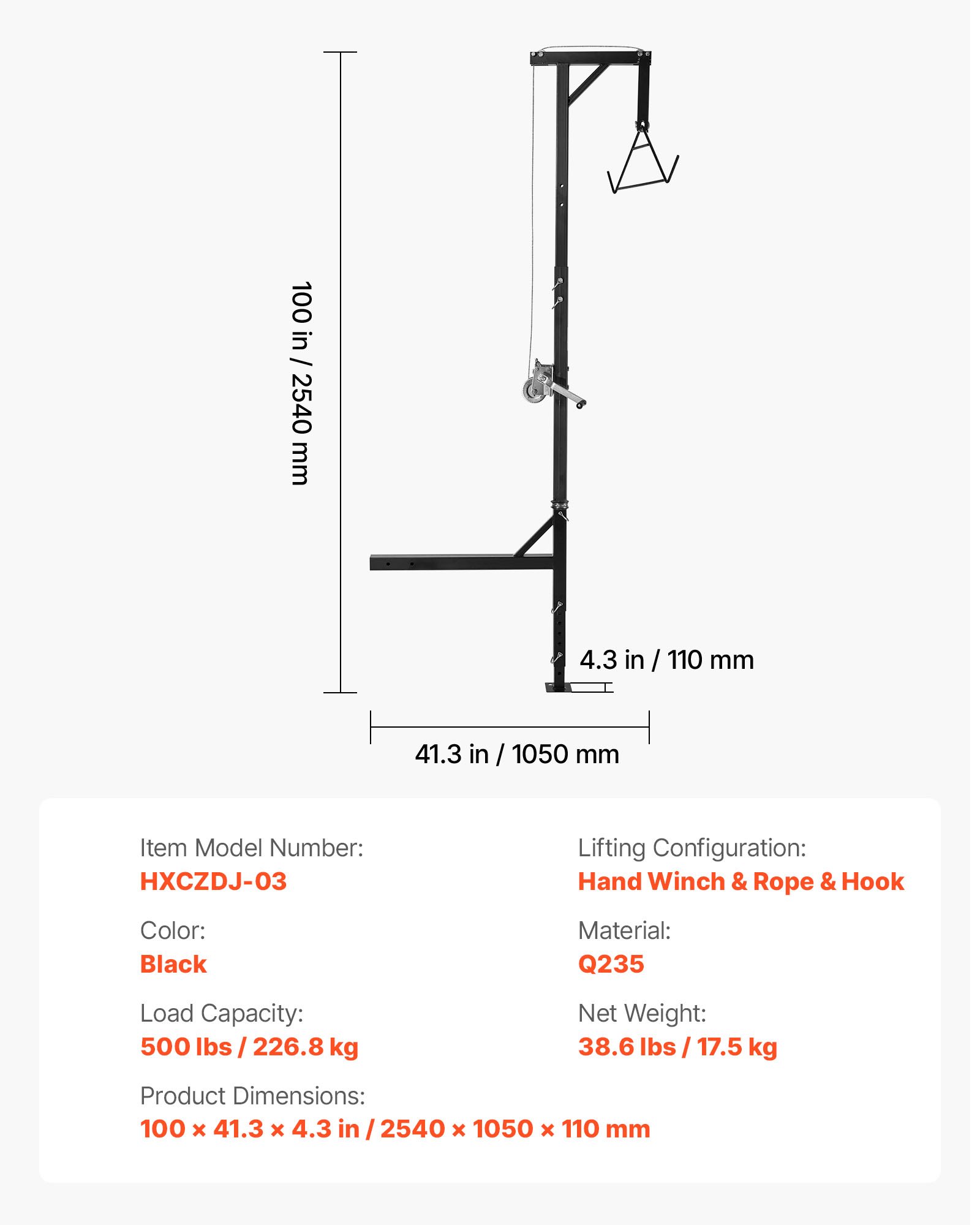 This manual game hoist offers stable support, lifting up to 500 lbs of game. Made of durable Q235 carbon steel, with a rust-resistant coating, it's ideal for outdoor hunting, farm work, and lifting heavy items, even in areas without electricity. Easy to clean and maintain.