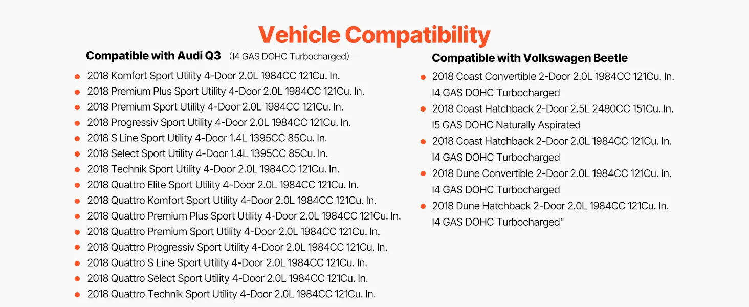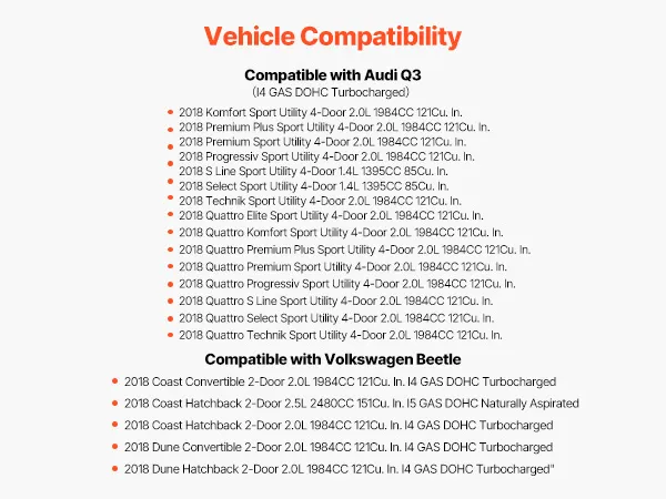 • Vehicle Fitment: This wheel hub assembly is tailored for specific models, compatible with 2018 Audi Q3 Komfort and Volkswagen Beetle Coast Convertible vehicles. Note: Please check the fitment chart on the page to confirm compatibility with your car
