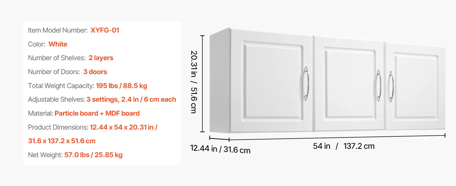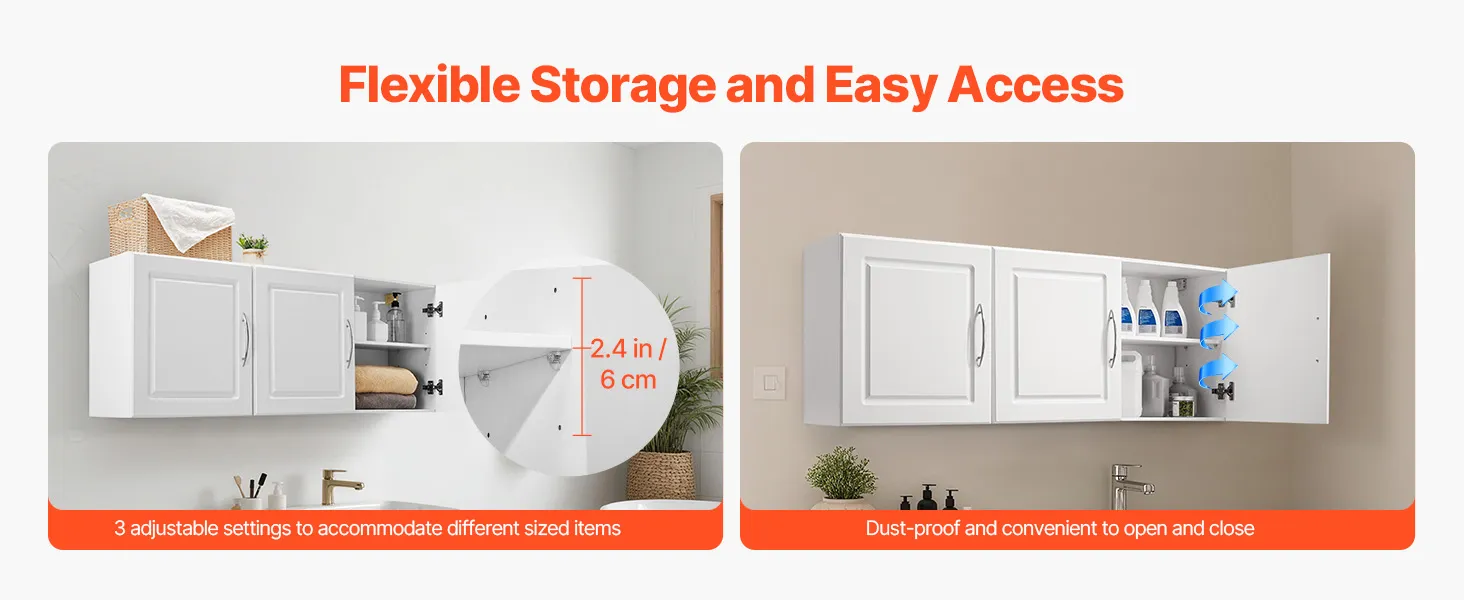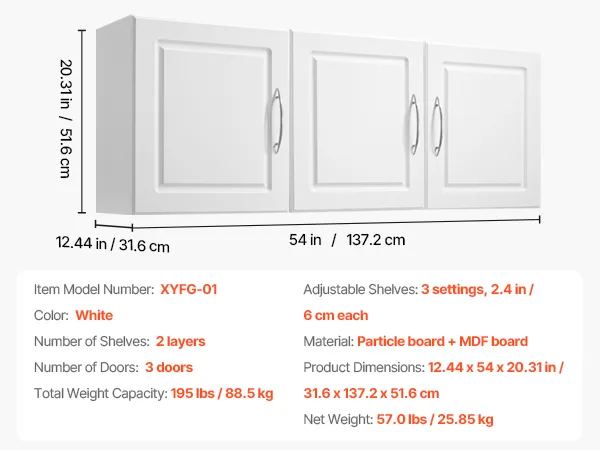 VEVOR Laundry Room Wall Cabinet, 2-Tier Wall Mounted Hanging Cabinet with Adjustable Shelf, Cupboard Storage with 3 Doors, for Kitchen, Bathroom, Laundry, 31.6 x 137.2 x 51.6 cm (D x W x H), White