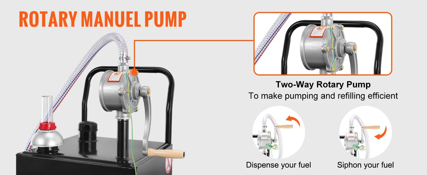 The efficient bi-directional pump dispenses or siphons fuel by changing the rotation of the crank handle, allowing you to eliminate overfilling tanks by pulling excess gas or diesel back into the caddy.