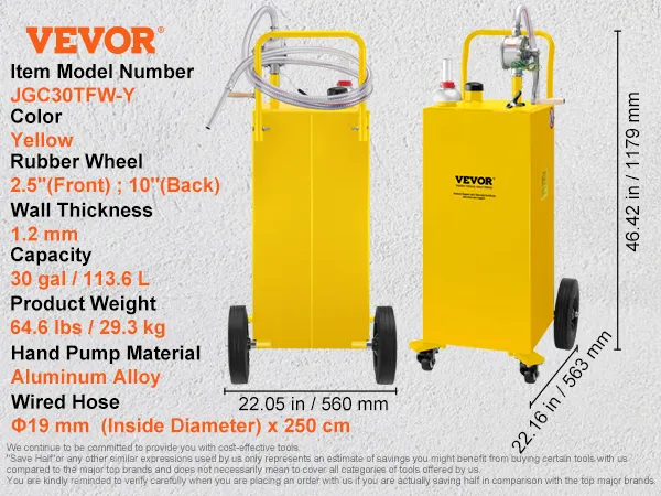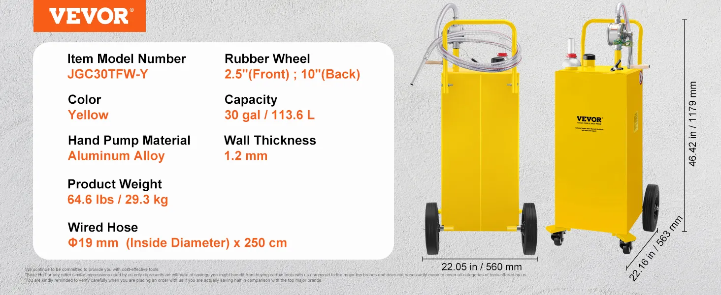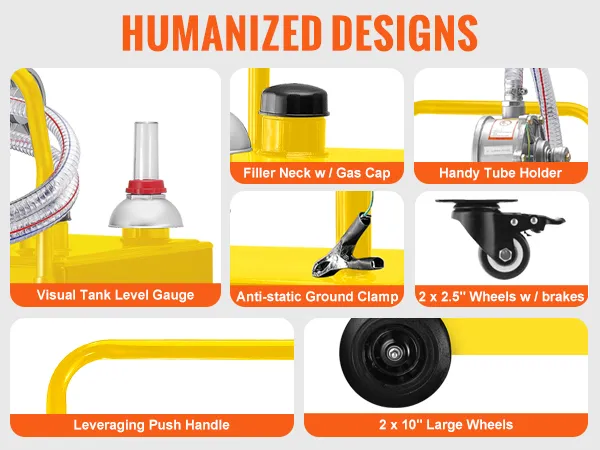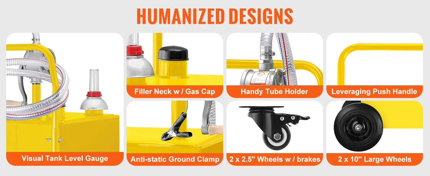 The gas caddy has a premium structure. It includes 10" large wheels and 2.5" small wheels, an anti-static ground clamp, filler neck with gas cap, handy tube holder, and an easy leverage push handle.All these designs will support efficient and secure work.