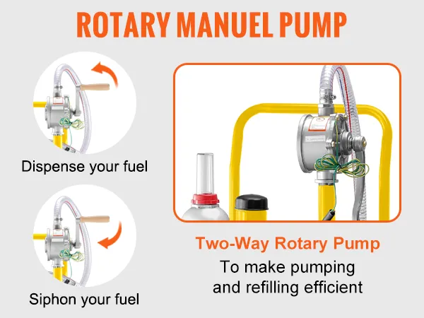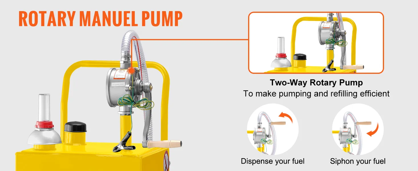 The efficient bi-directional pump dispenses or siphons fuel by changing the rotation of the crank handle, allowing you to eliminate overfilling tanks by pulling excess gas or diesel back into the caddy.