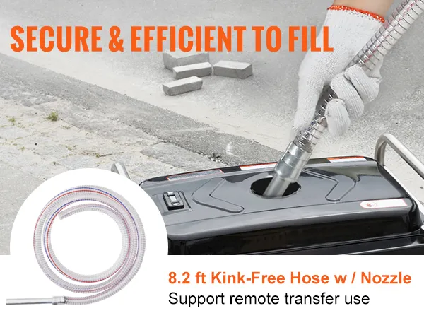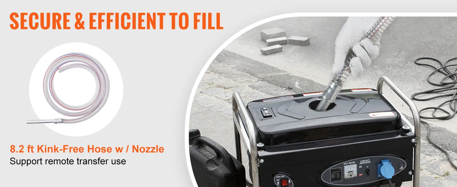 8.2 FT automotive-grade rubber hose facilitates efficient and safe fueling. The heavy-duty nozzle supports fast fuel delivery. Just open the clip and let it flow. You can quickly fill your fuel tank in minutes.