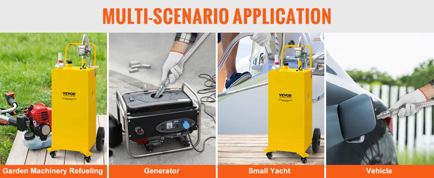 The portable gas tank is designed to transport diesel or gasoline fuel to your job site. It is ideal for tanker trucks, ships, outdoor industries, construction industries, and more.