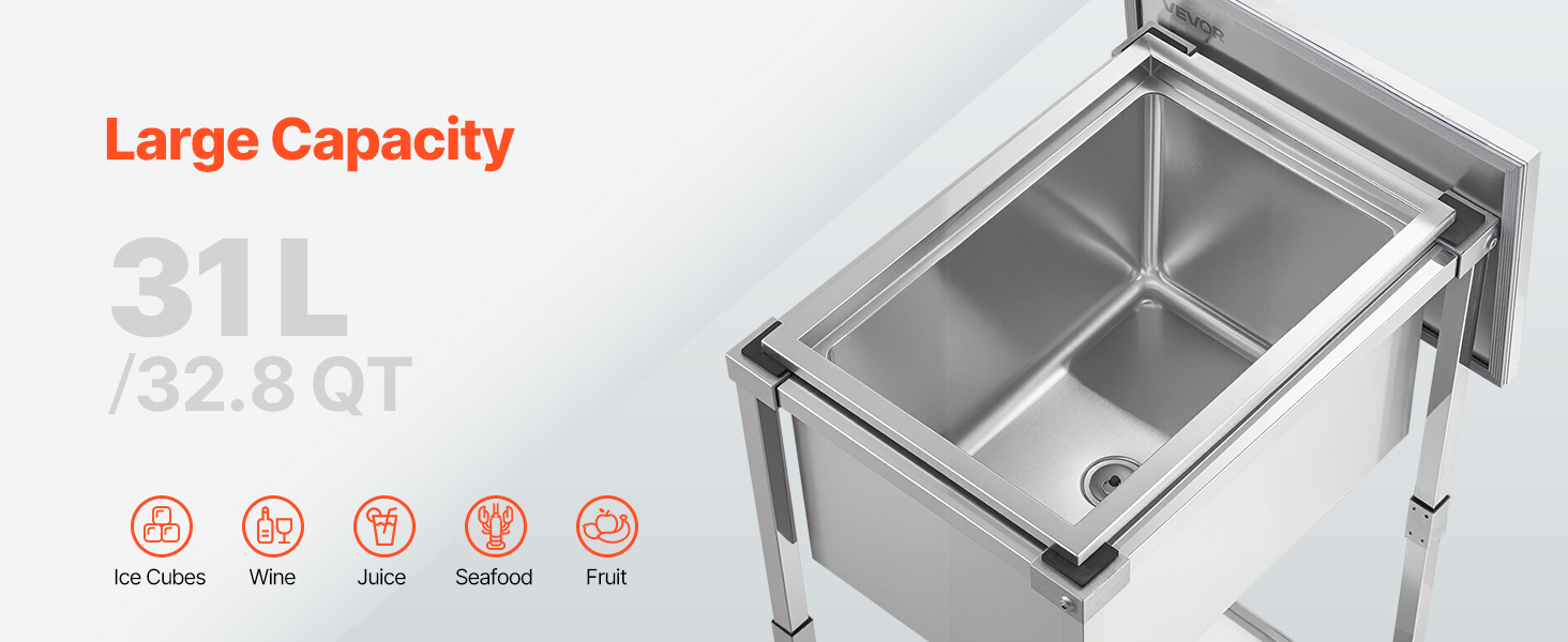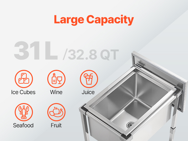 • Large Capacity: A large-capacity drop in ice bin that can hold about 32.8QT (US Quart) / 31L of ice. When filled, it can make approximately 131 cups of 16oz beverages. Ideal for storing a large amount of ice or chilling various drinks, fresh food, fruits, and seafood