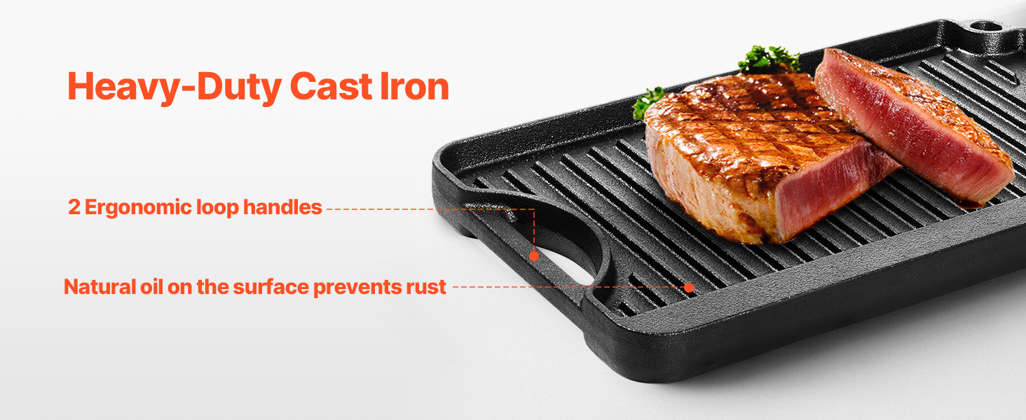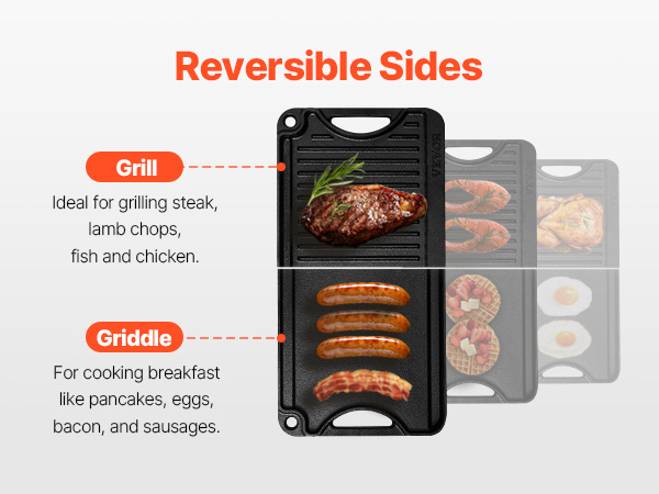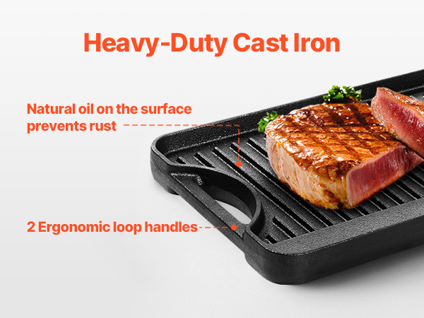 VEVOR Reversible Grill/Griddle, 14x8.5 inch Pre-Seasoned Cast Iron Griddle, Portable Rectangular Pan with Handle, Family Cookware for Indoor/Outdoor Stove Top Burner, Gas, Camping BBQ, Black