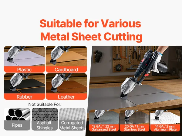 More than metals, this drill-powered shear adaptor cuts stainless steel, galvanized steel, aluminum, plastic, cardboard, rubber, and leather. Delivers clean, efficient results. Not for pipes, asphalt shingles, or corrugated metal.