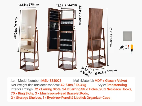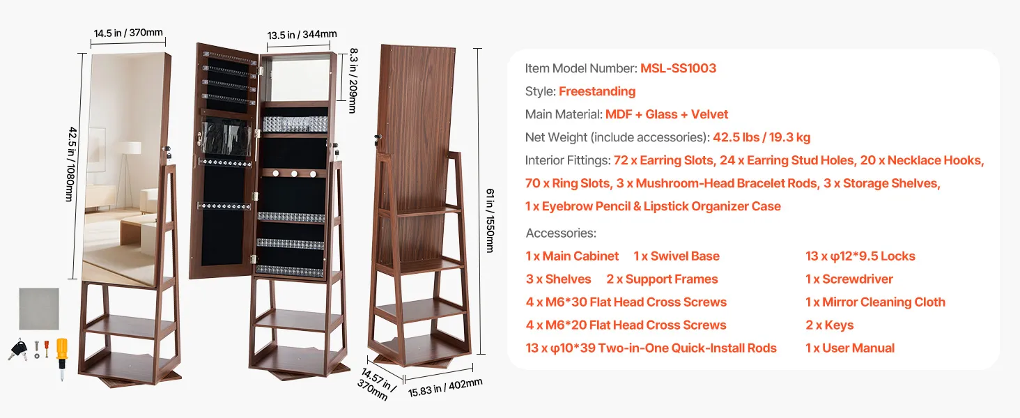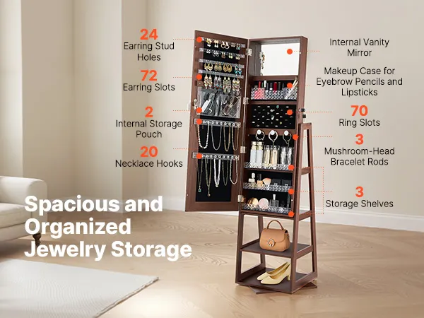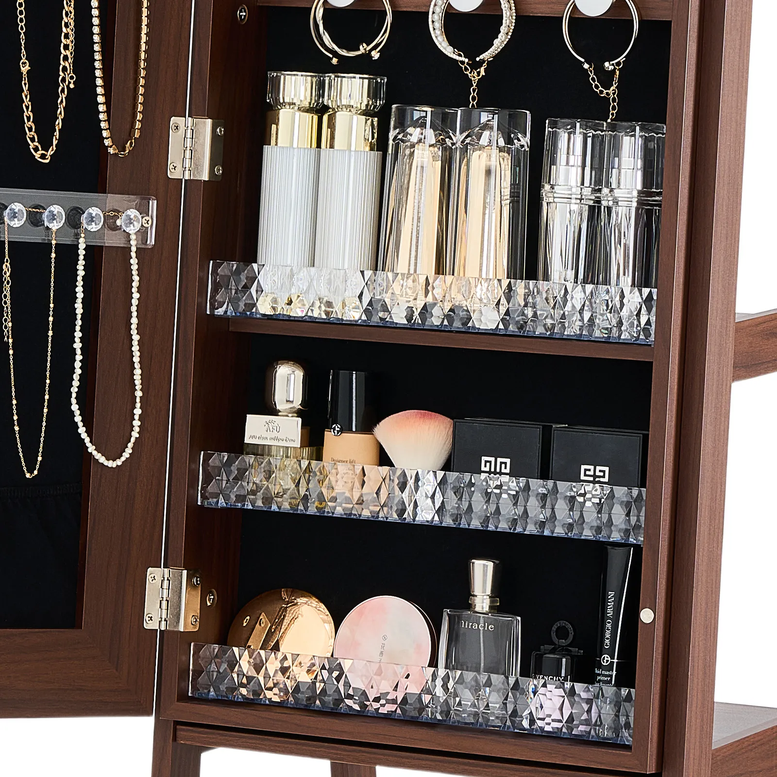 The swivel jewelry cabinet with mirror features acrylic shelves to hold infrequently used or valuable items, keeping them organized and secure.