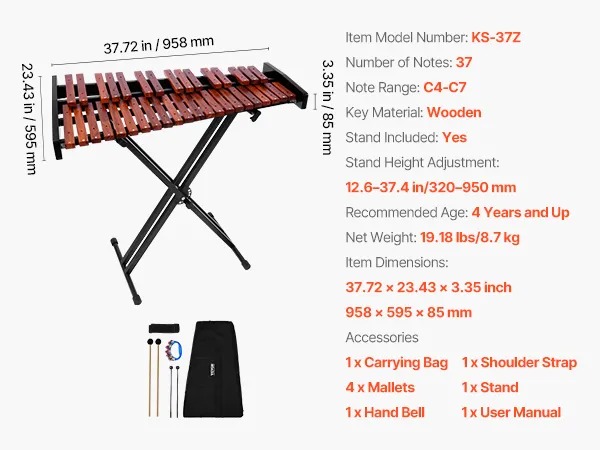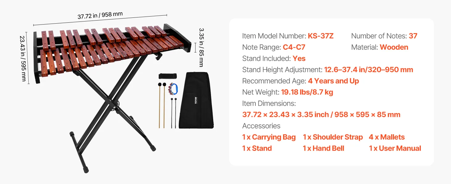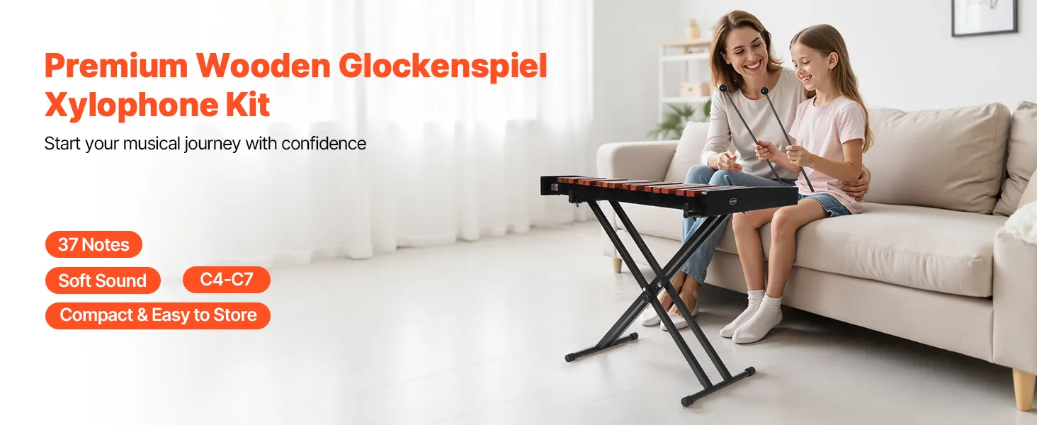 VEVOR Glockenspiel Xylophone, 37 Notes, Wooden Professional Xylophone Percussion Instrument, with Height Adjustable Stand, 4 Mallets, Carrying Bag, Beginner Musical Instrument Kit for Adults and Kids
