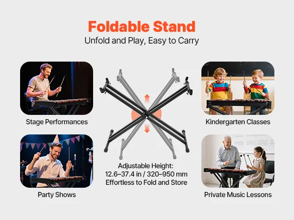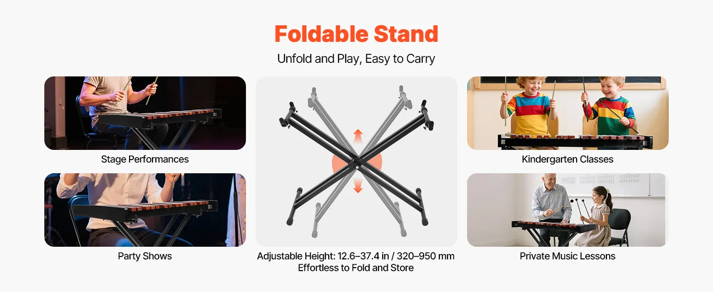 Our xylophone percussion instrument includes a foldable X-stand made of carbon steel—durable, stable, and shake-free during play. The height is flexibly adjustable to fit players of all ages. Folds down compactly to store in the carrying bag for travel or storage.