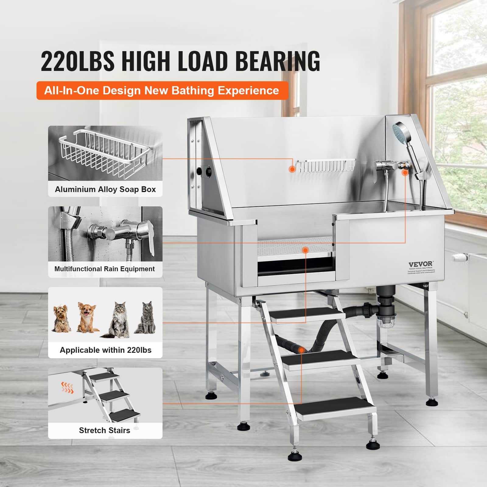 Suitable for pets with a body size of up to 34" and a weight of up to 220lbs. The seamless welding support bracket eliminates the risk of water leakage when cleaning pets, and shower gel does not adhere to the walls, making cleaning easier.