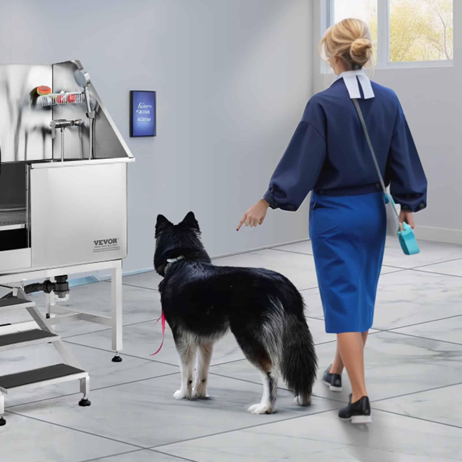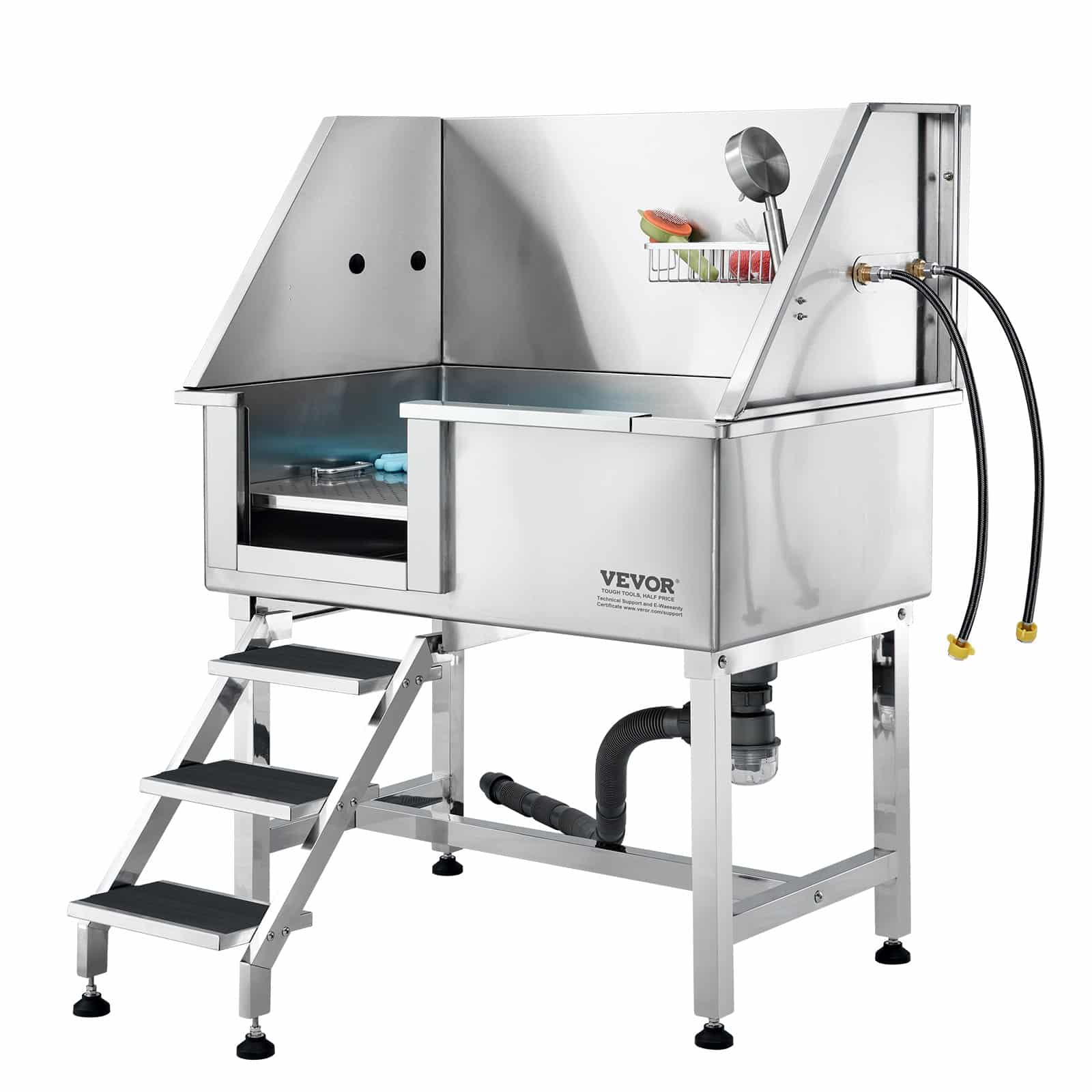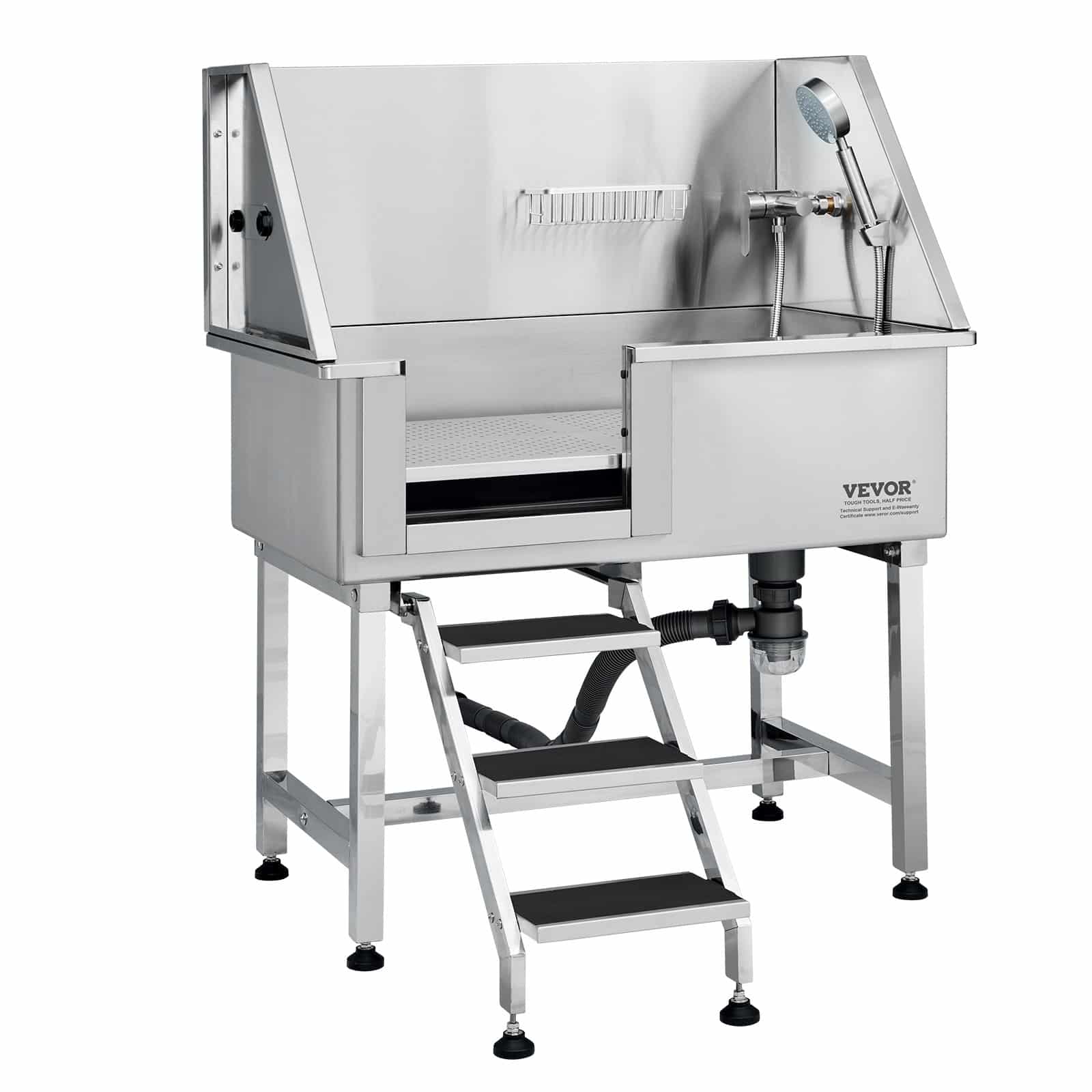 VEVOR 96.5 cm Pet Dog Bathing Station w/Ramp, Professional Stainless Steel Dog Grooming Tub w/ Storage Drawer, Floor Grate, Faucet, Dog Bathtub for Large, Medium, Small Pets, Washing Sink for Home(Left)