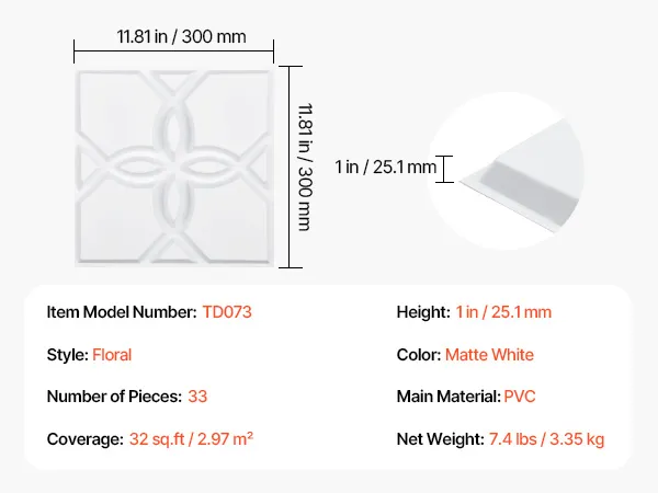 VEVOR 3D Wall Panels 33-Pack, 30×30 cm PVC Floral Tiles, 3 m² Coverage, Matte White Decorative Panels for Interior Walls