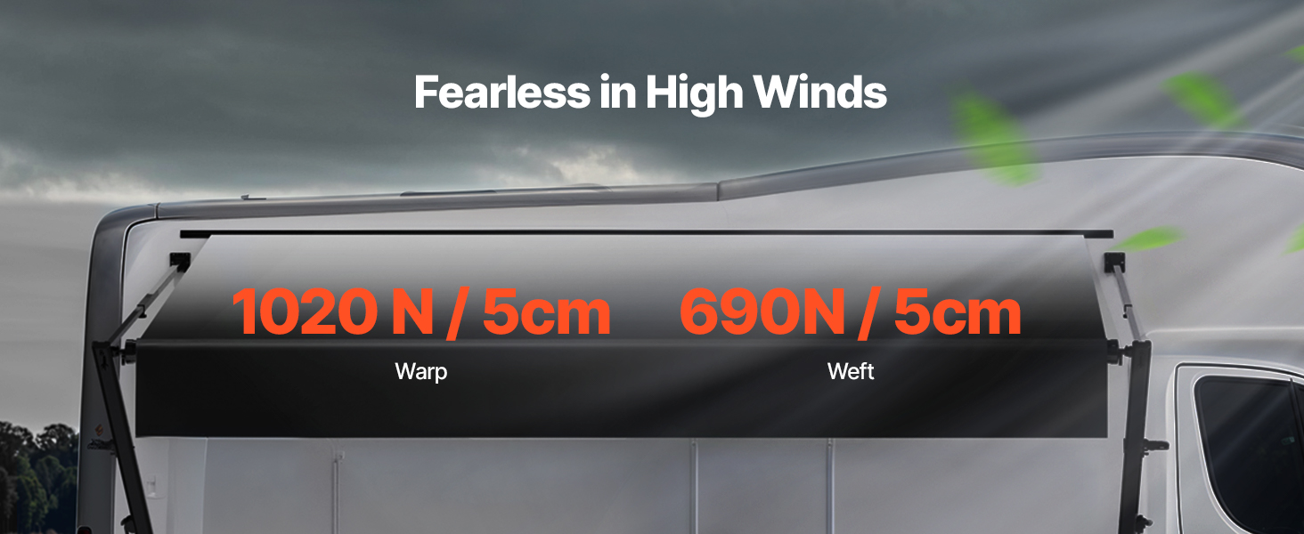 We offer a durable RV awning with upgraded 18oz 4-layer PVC vinyl fabric, designed to withstand changing weather. The reinforced aluminum alloy frame is waterproof, corrosion-resistant, and ensures long-lasting stability and durability.