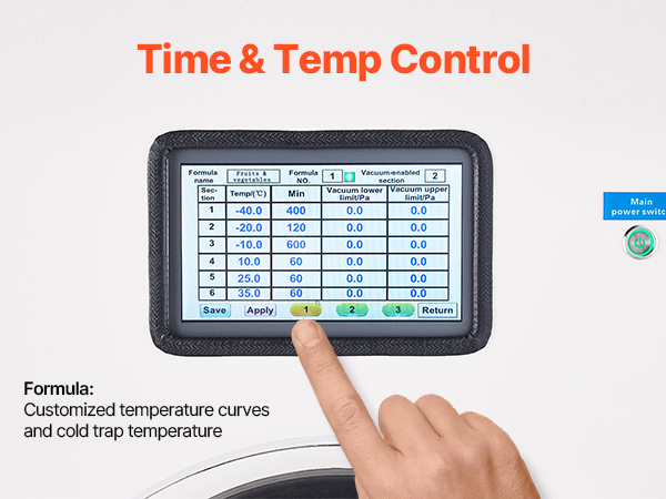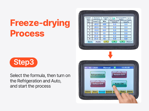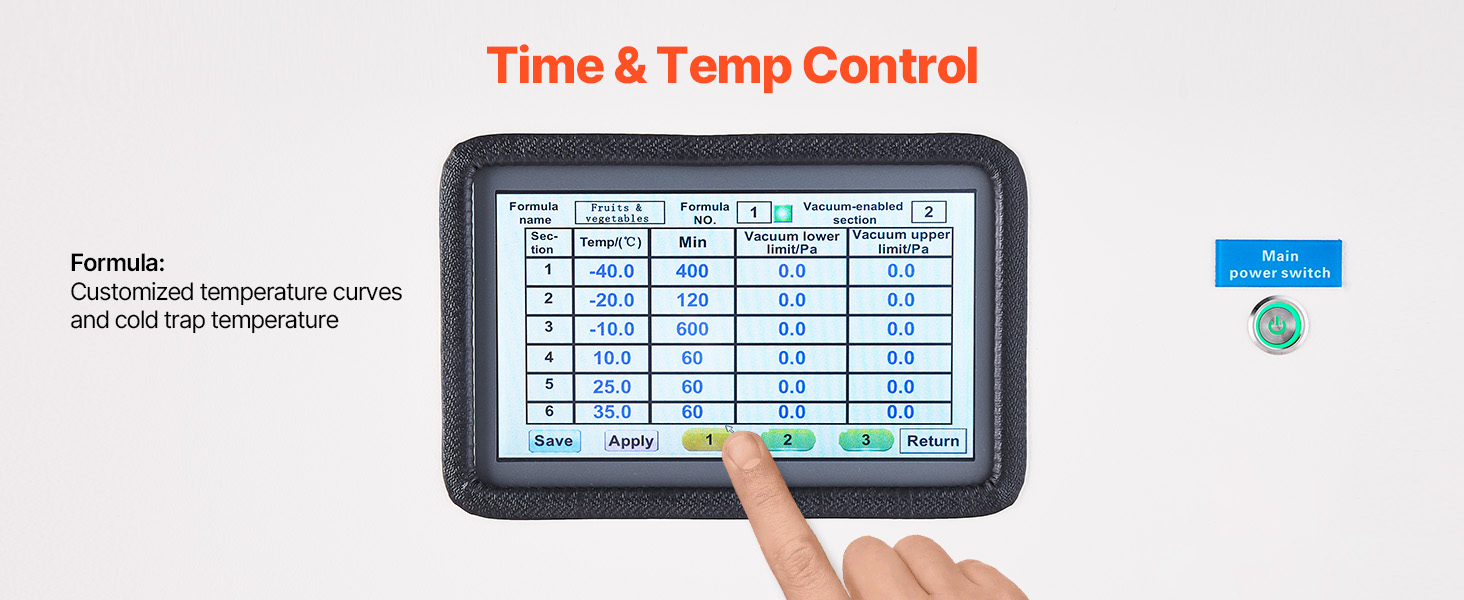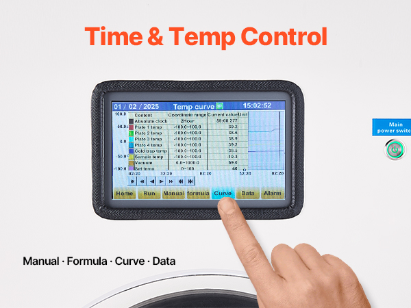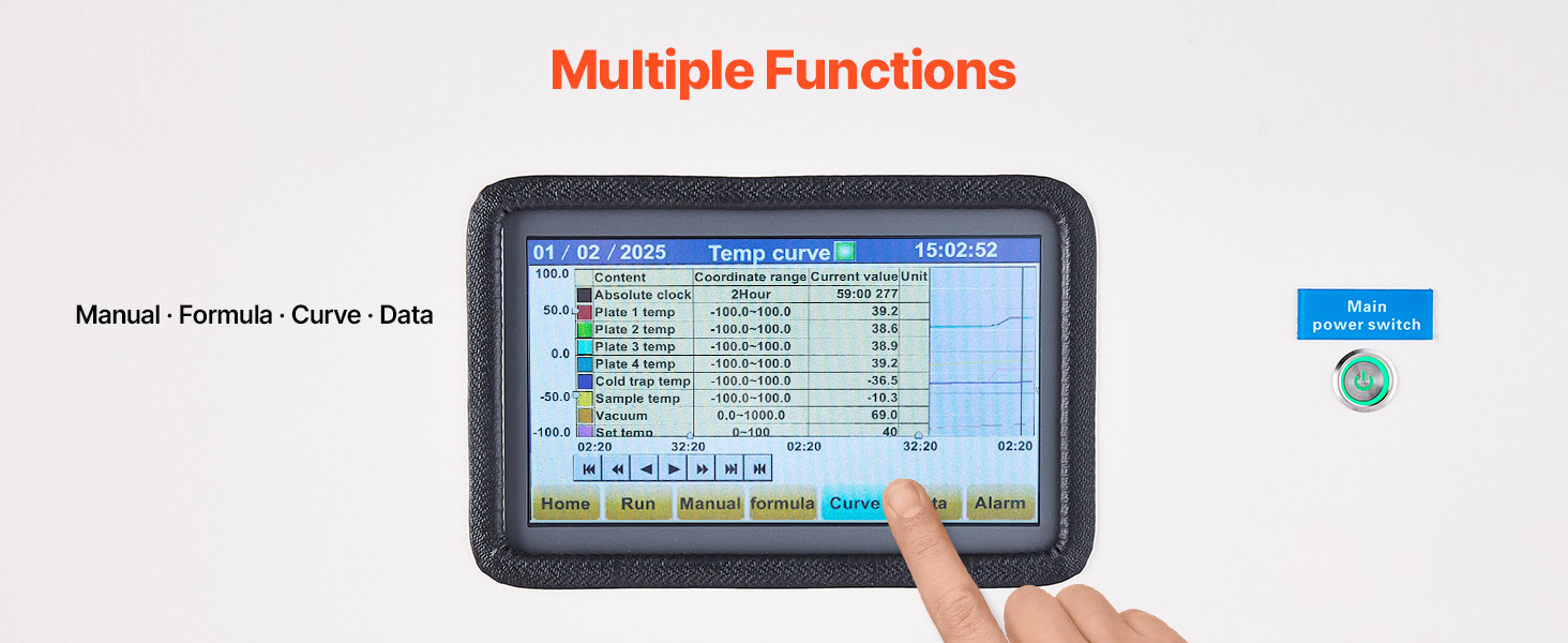 The high-definition touch screen ensures convenient operation, with powerful features and segmented drying curves to meet the freeze-drying needs of various materials. Please ensure the use of a properly grounded power outlet, with operating ambient temperature ≤30°C.