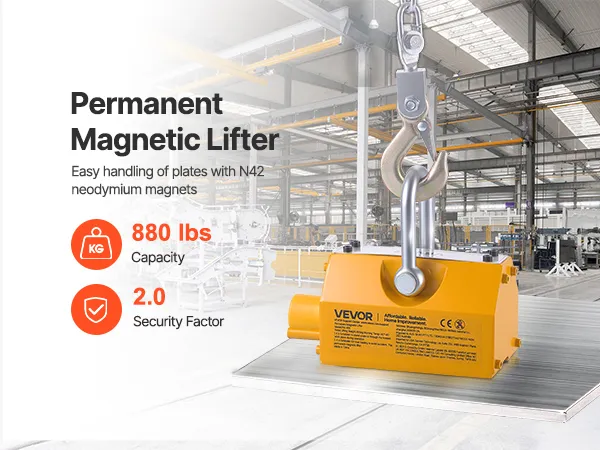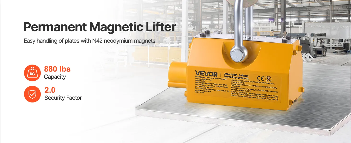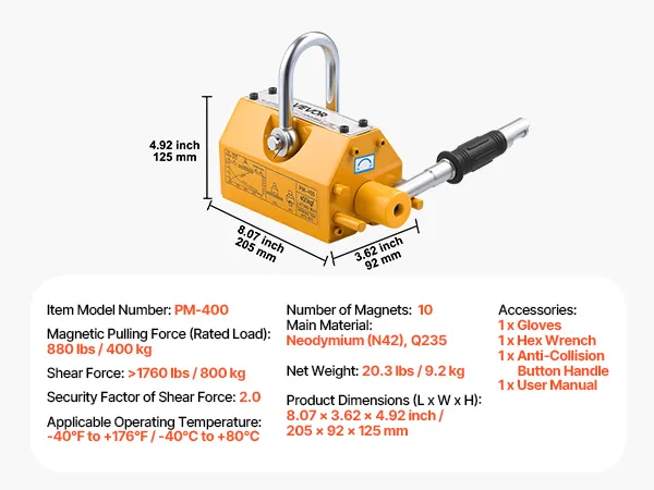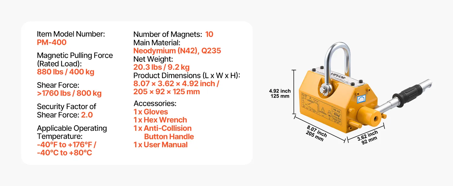 • Powerful Magnetic Force: The permanent magnetic lifter delivers up to 880 lbs / 400 kg of magnetic force with a 2.0 security factor. It features a high-grade N42 neodymium magnet for stable, powerful lifting performance