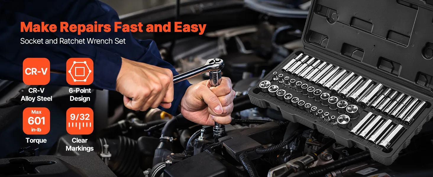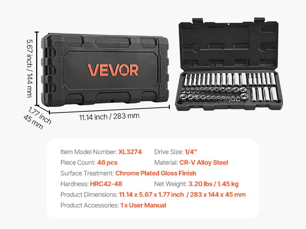 Набір головок VEVOR 46 шт., привід 6.4 мм, SAE та метричні, хромований CR-V сталь, глибокі та стандартні, з кейсом для авто ремонту