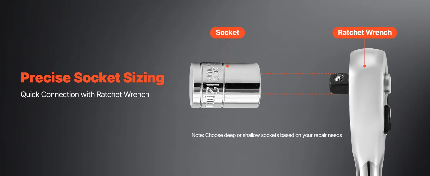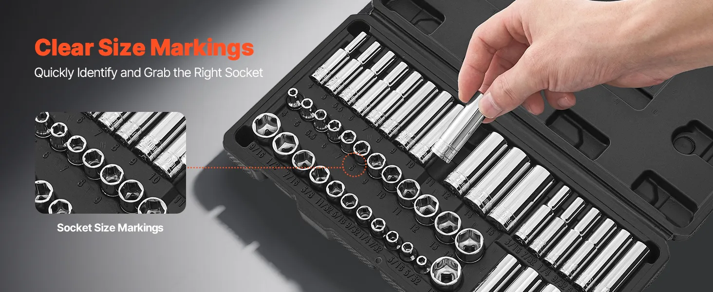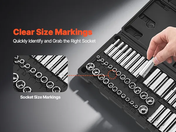• Easy-to-Read Sizes: Size markings on the socket tool set are precision-rolled for clear, raised engraving, allowing quick and accurate identification by sight or touch—even in low light or greasy conditions—greatly improving work efficiency